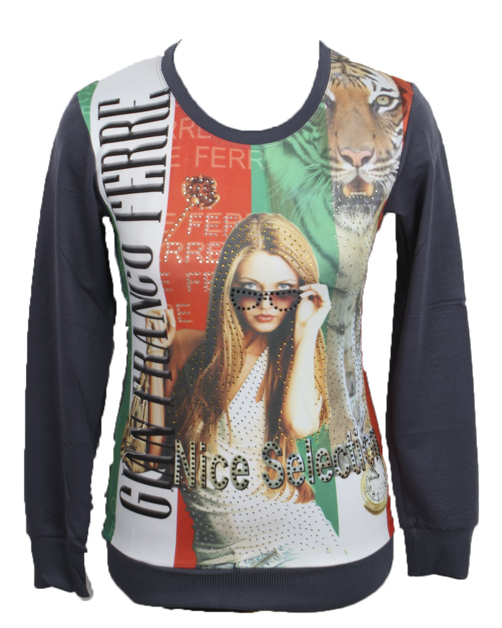 Женский джкмпер металлического цвета с принтом на передней части изделия.