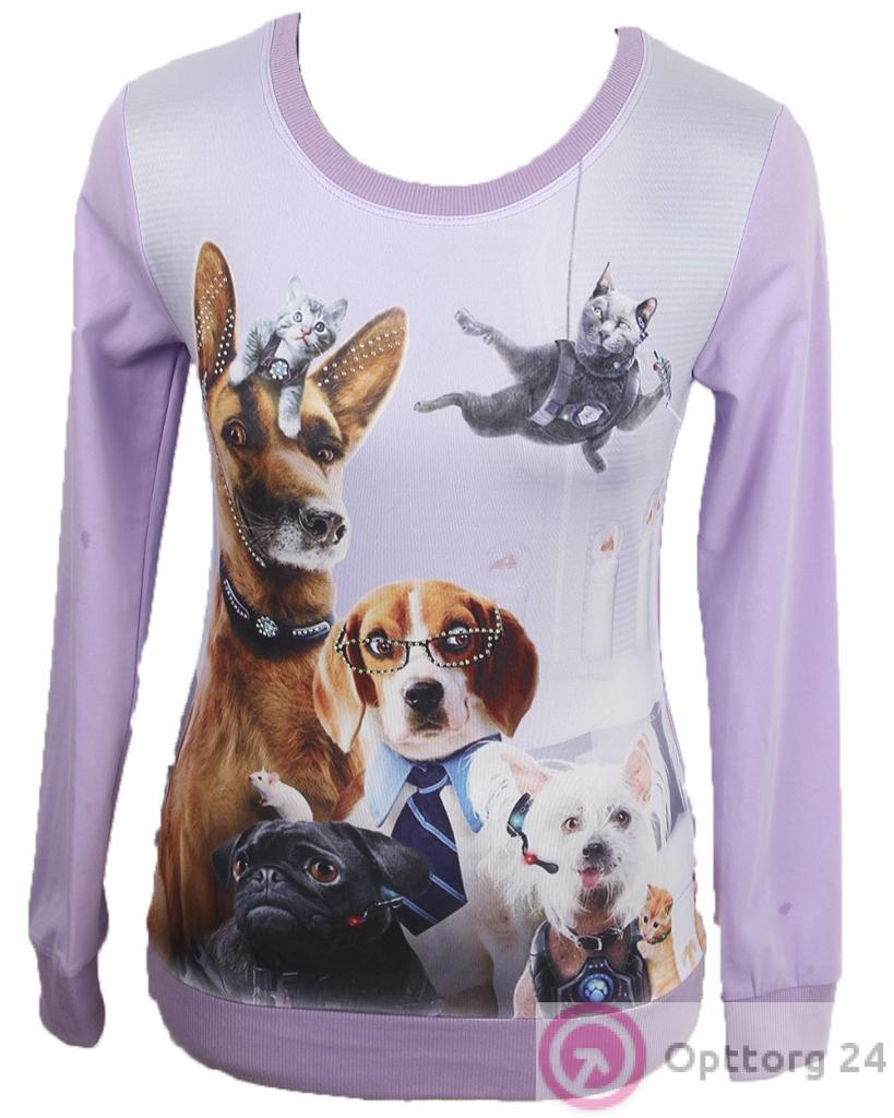 Женский джемпер сиреневого цвета с принтом в виде заставки "Кошки против собак"