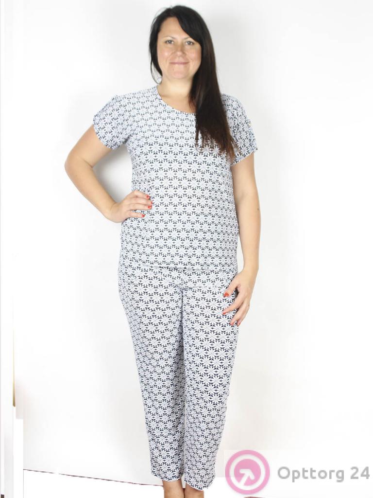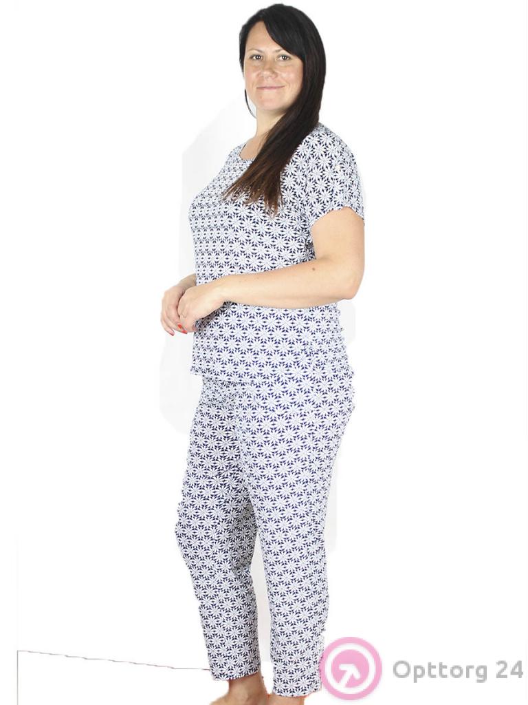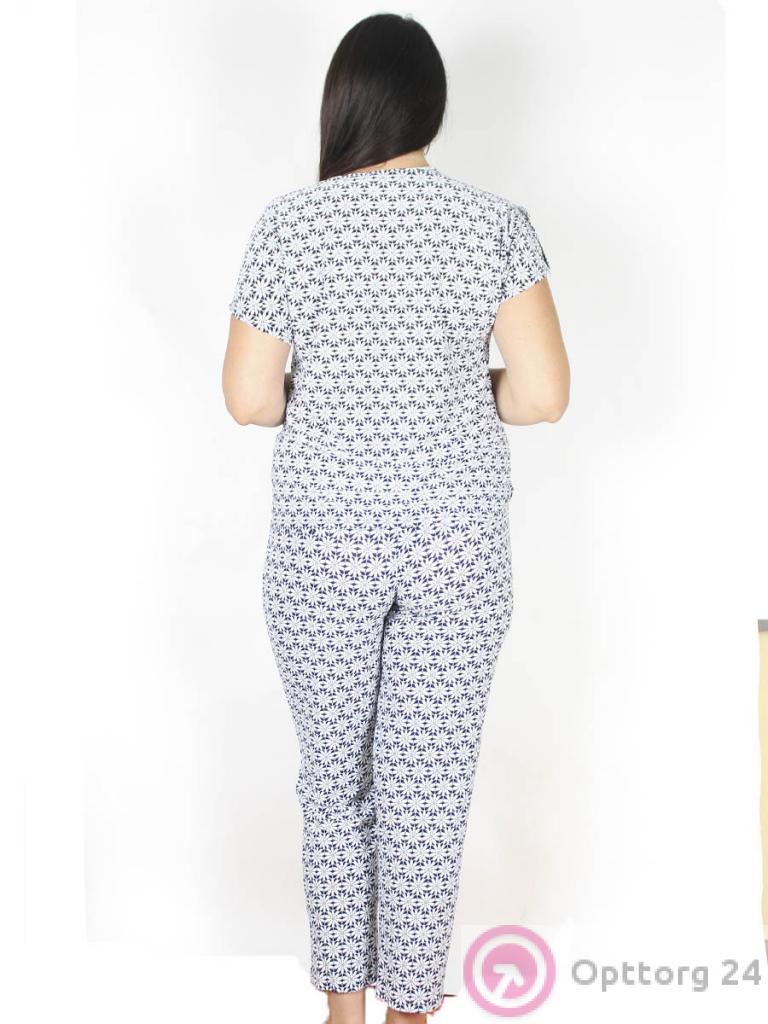 Костюм женский, модель двойка футболка+штаны. Разукрашенна модель белым мелким цветком.