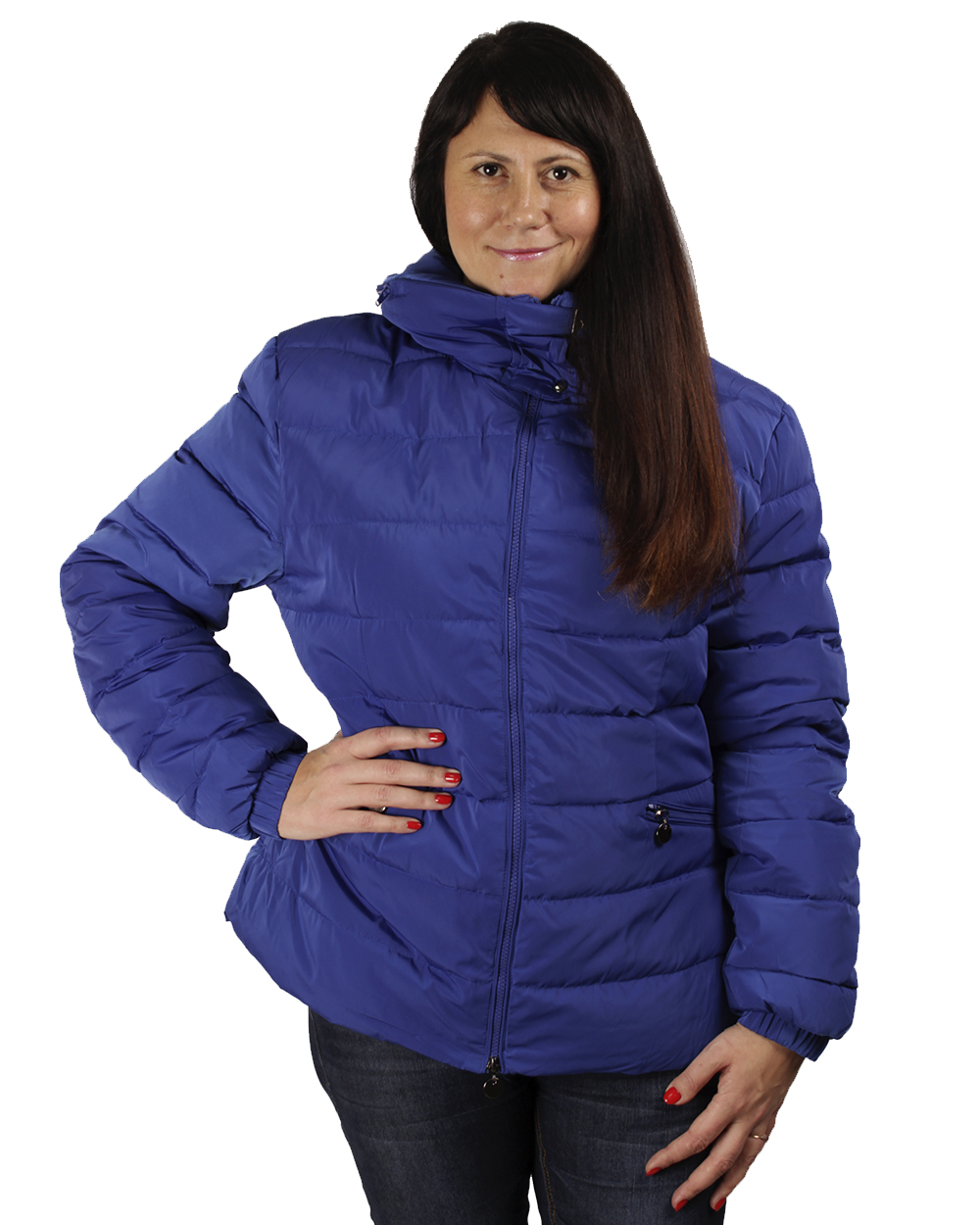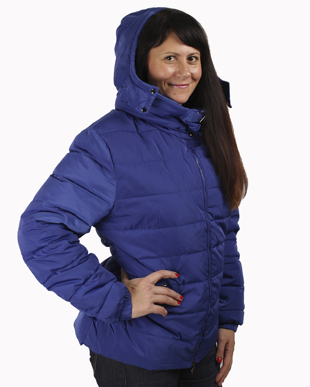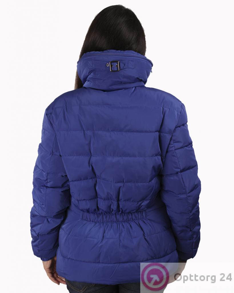 Женский пуховик синего цвета, Набивка- натуральный пух, Утеплённая модель. В воротнике под молнией спрятан капюшон.