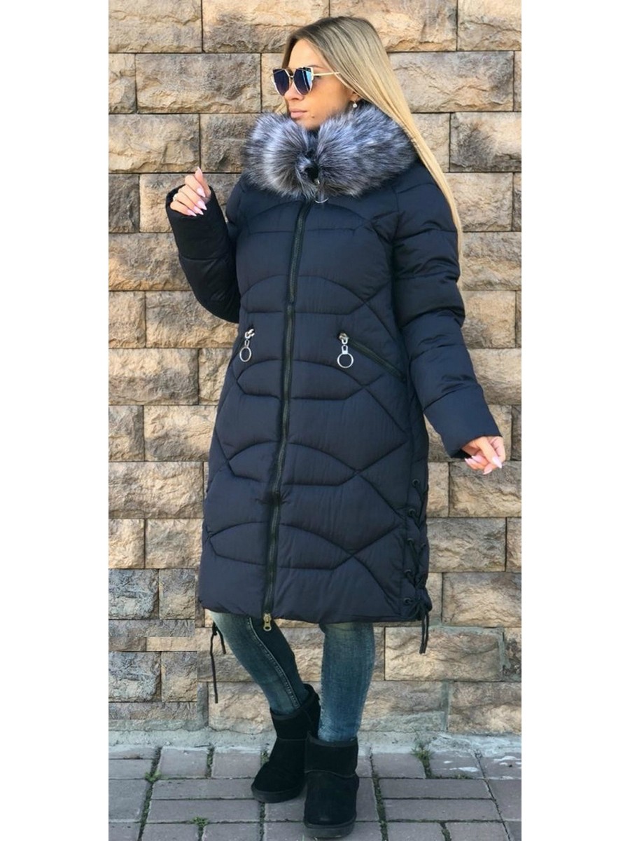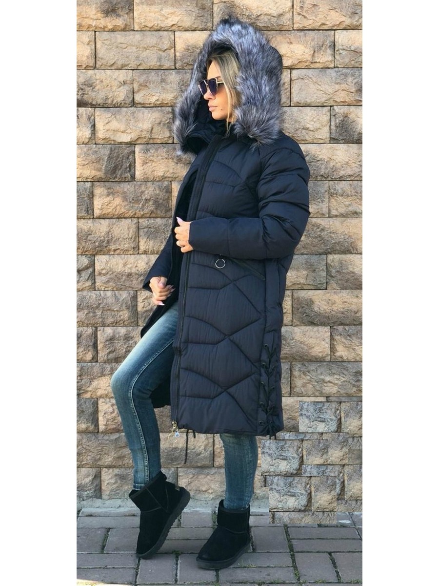 Женская куртка черного цвета со шнуровкой по бокам и капюшоном с мехом. Свободный силуэт.