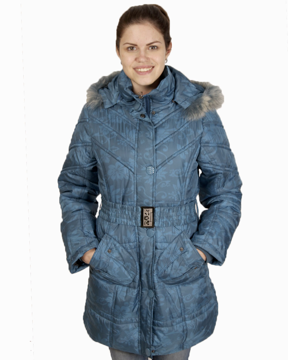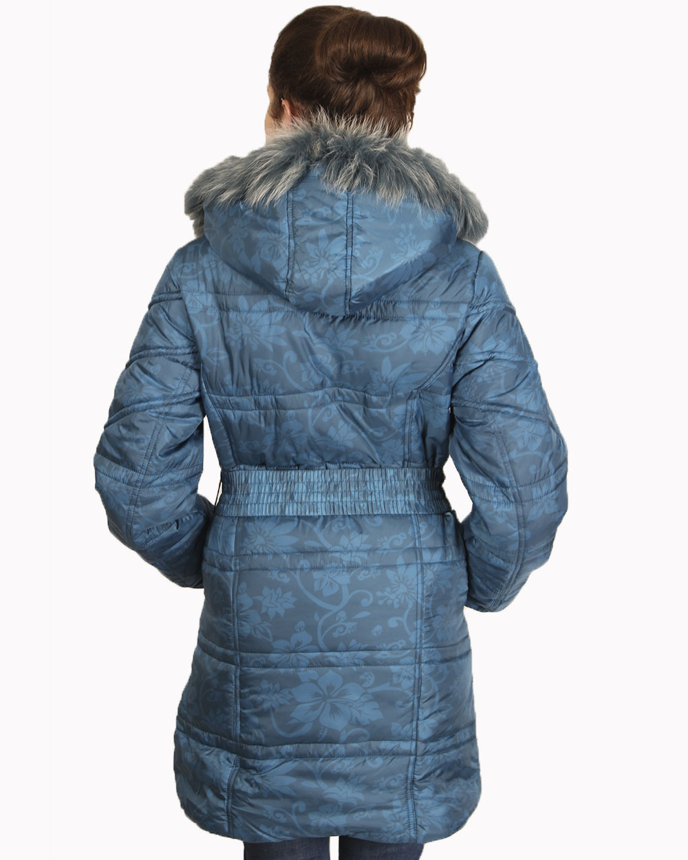 Стильный женский пуховик голубого цвета. По всей поверхности модель украшена цветами.