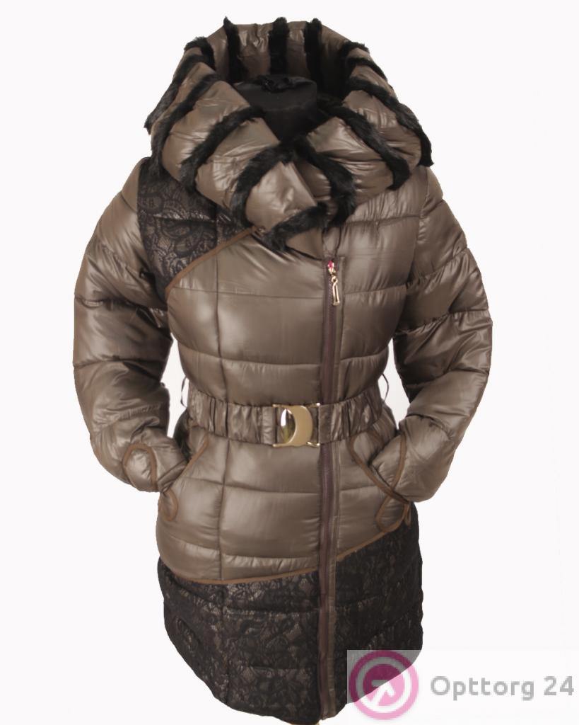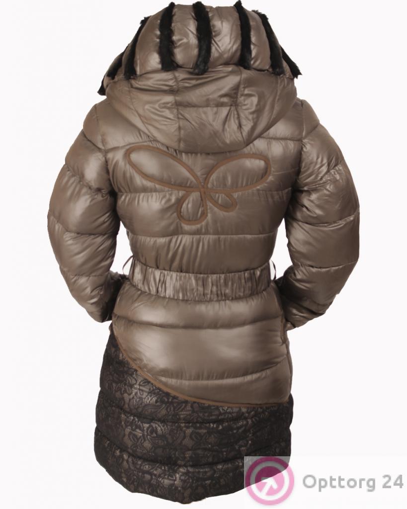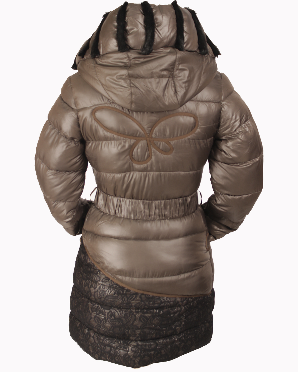 Женский пуховик коричневого цвета, Нижняя часть модели украшены кружевной нашивкой которая придаёт изделию неповторимый стиль.