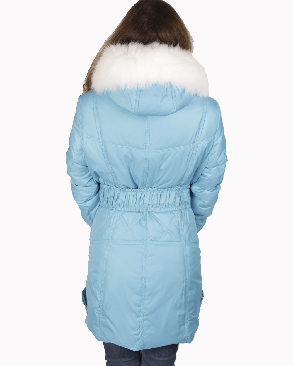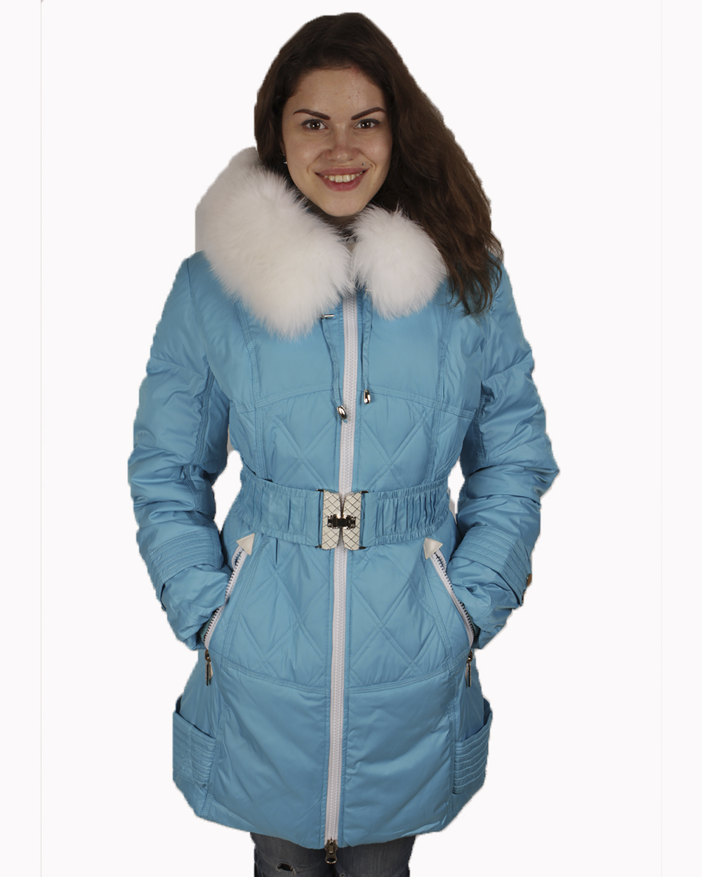 Женский ярко-голубой пуховик на двойном синтепоне. Натуральный мех на капюшоне