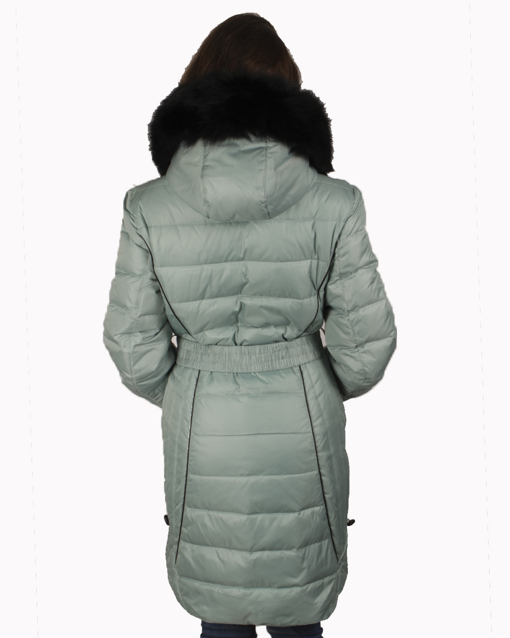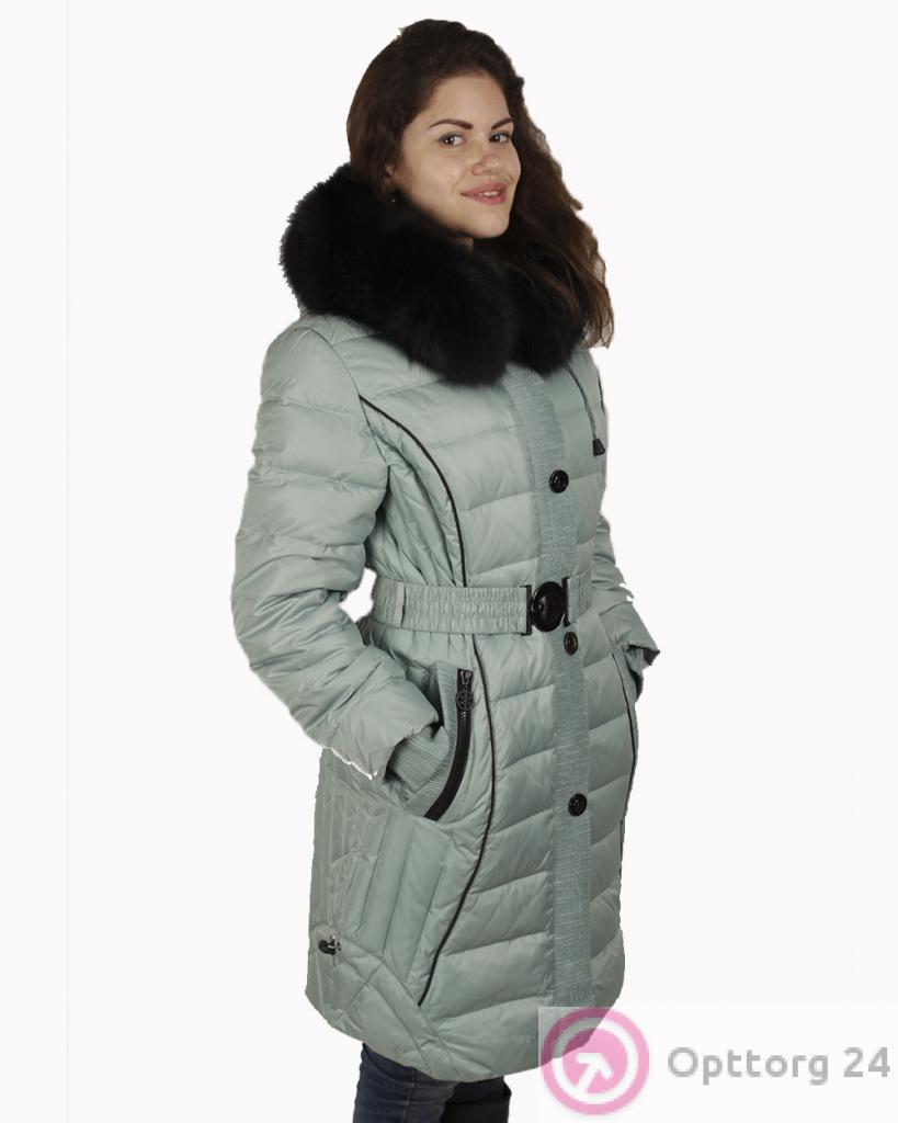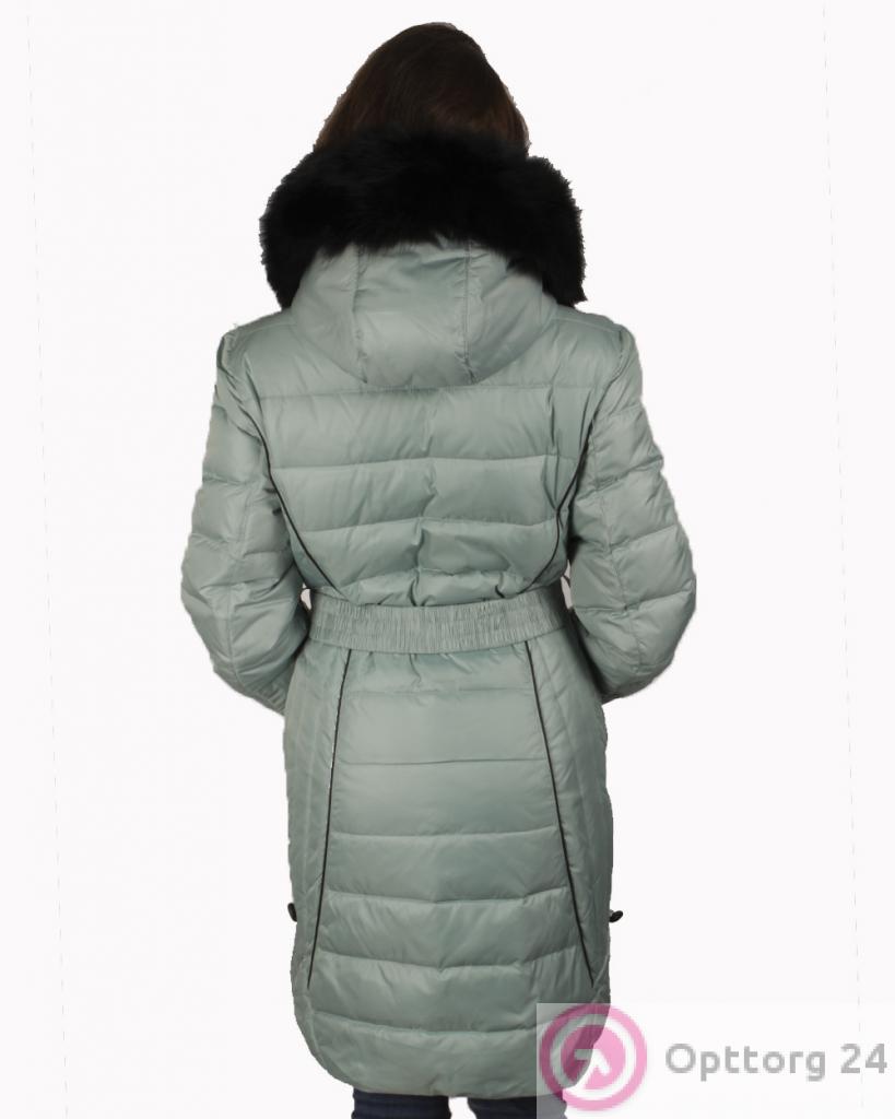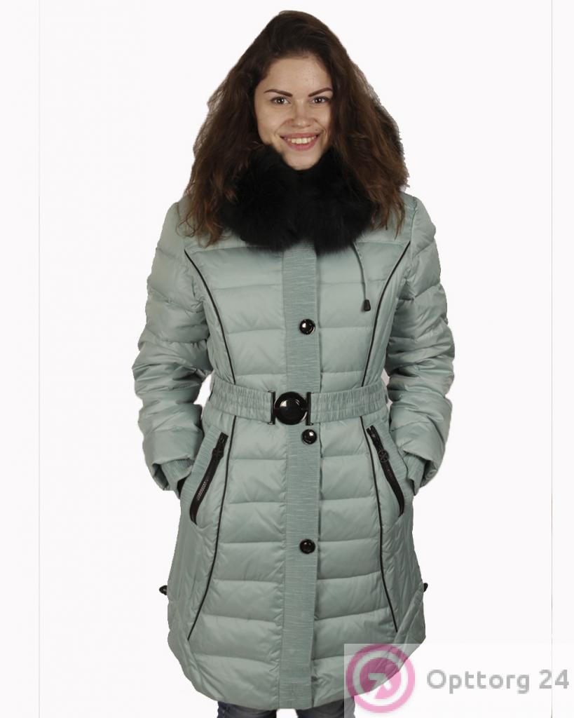 Женский утепленный пуховик на двойном синтепоне украшенна мягкой опушкой в области застёжки.