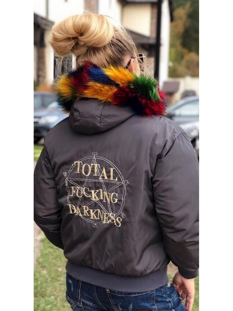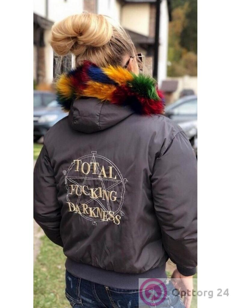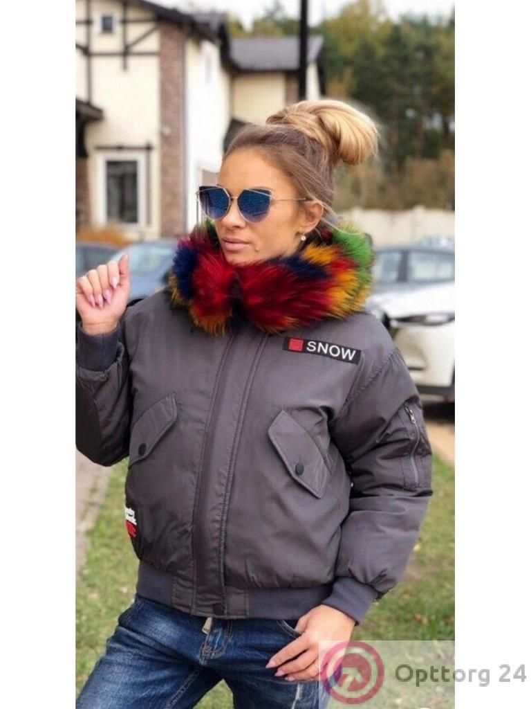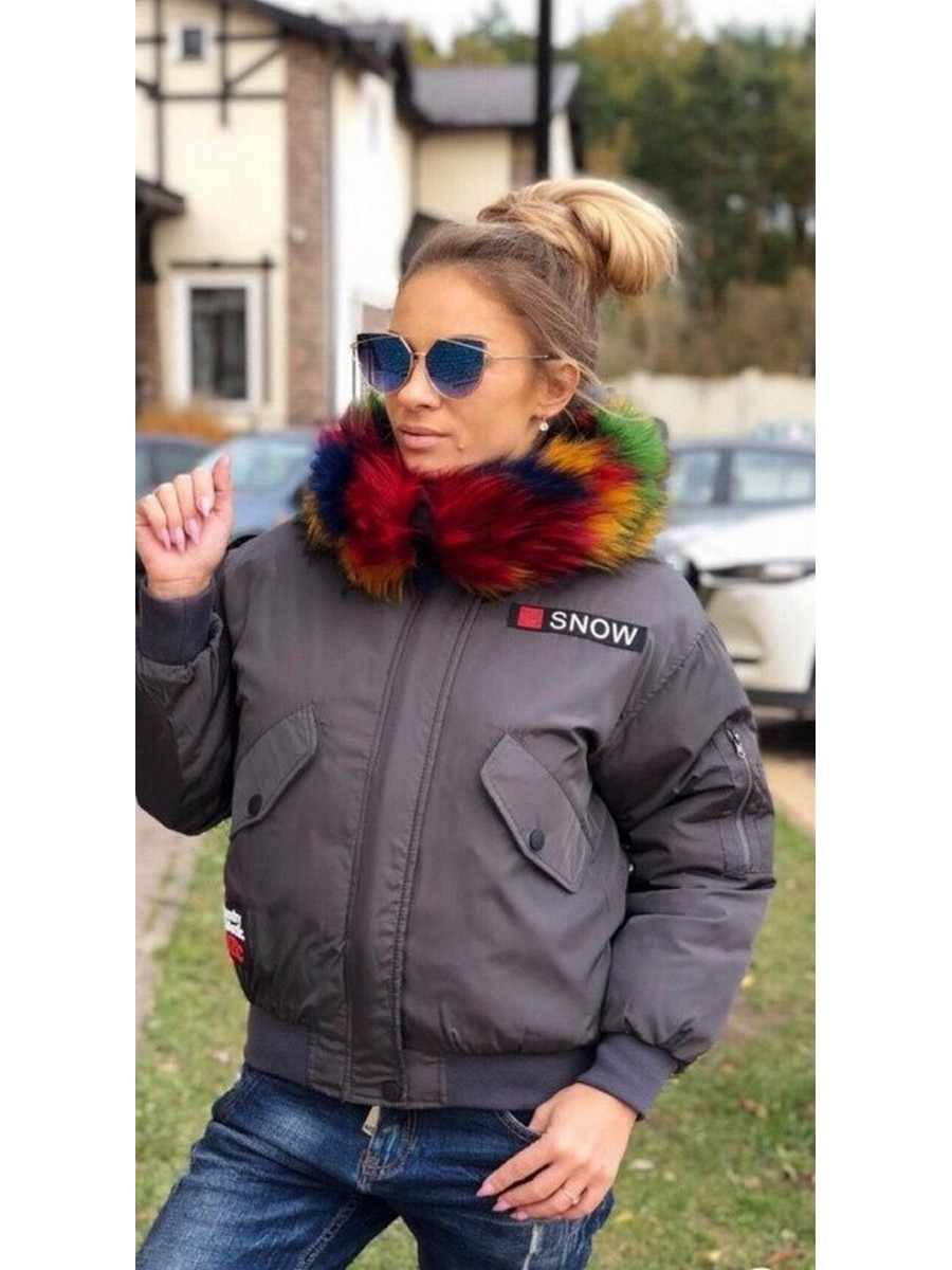 Укороченный женский пуховик серого цвета с разноцветным мехом на воротнике. На спине вышивка.