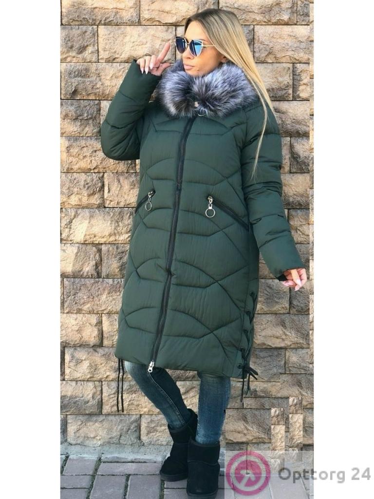 Женская молодежная куртка темно-зеленого, по бокам шнуровка, капюшон с мехом. Свободный силуэт. В наличии большие размеры.