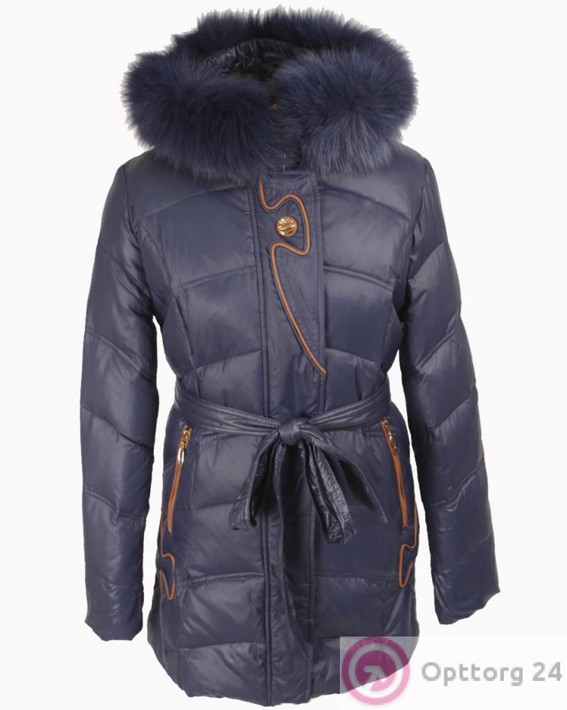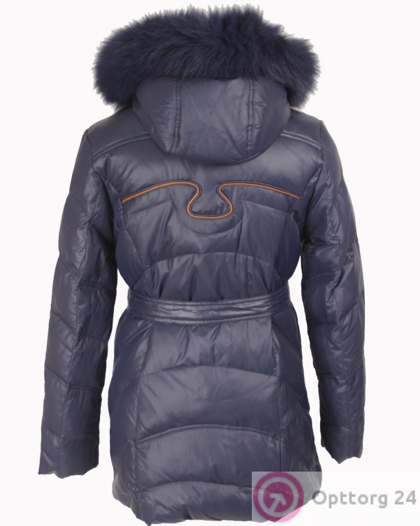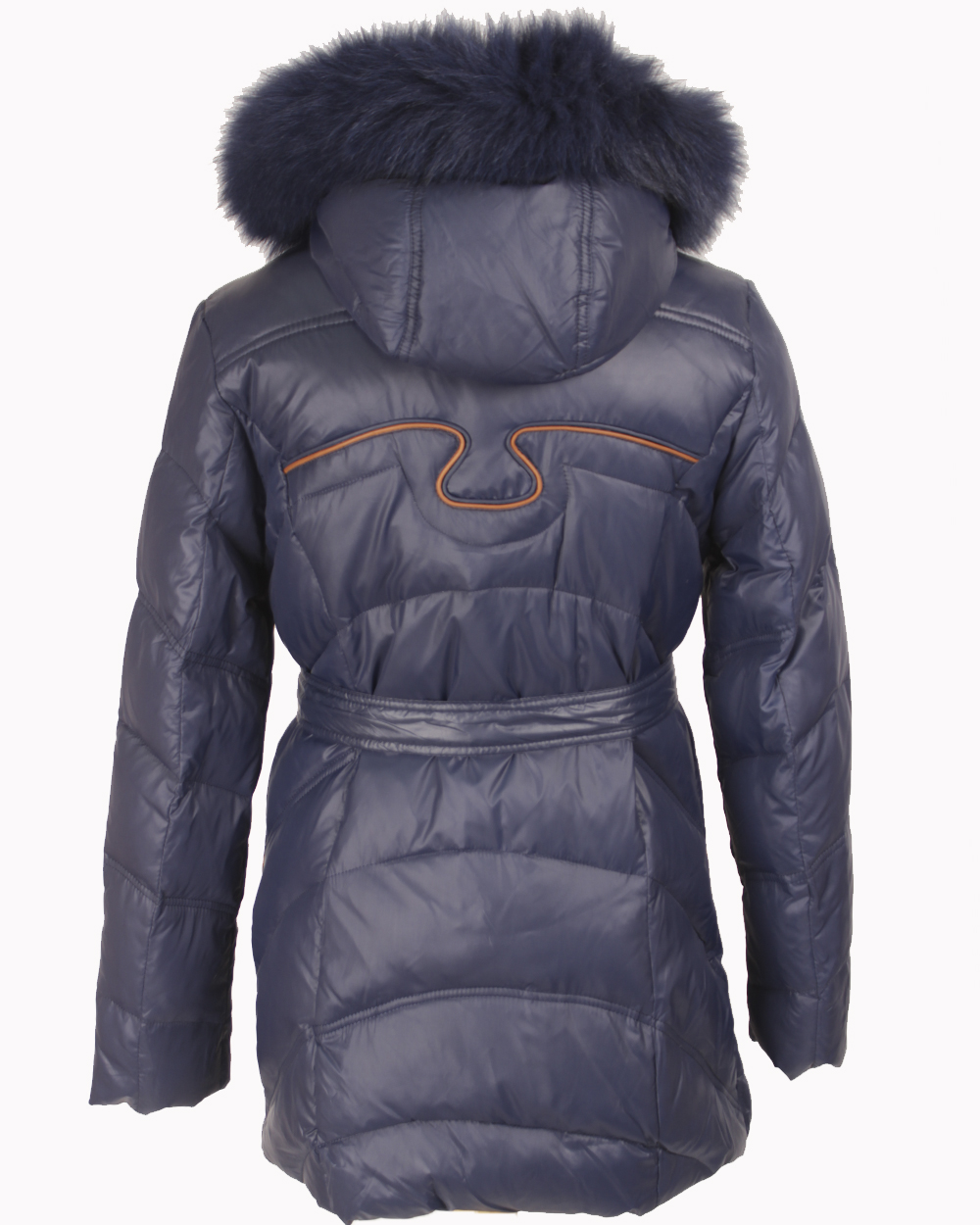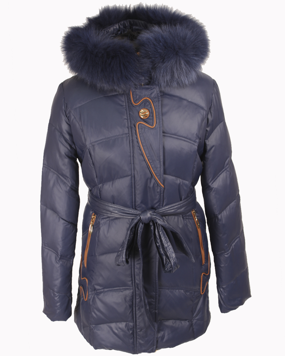 Женский пуховик тёмно синего цвета с поясом. модель имеет узор на задней части изделия. Наполнитель двойной синтепон. Ворот покрыт натуральным мехом.