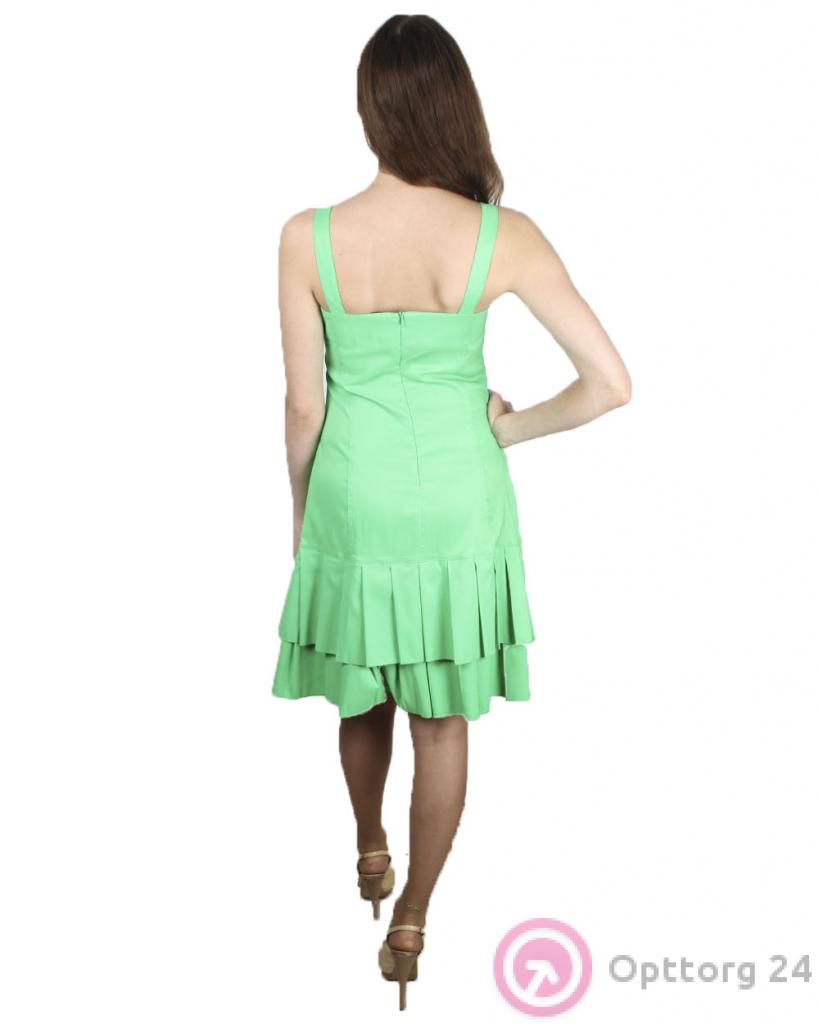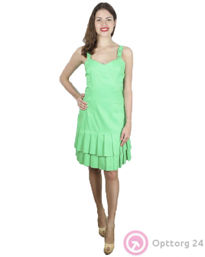 Женский сарафан ярко-зеленого цвета с открытыми плечсами. модель пряямого кроя со складками на юбке изделия.