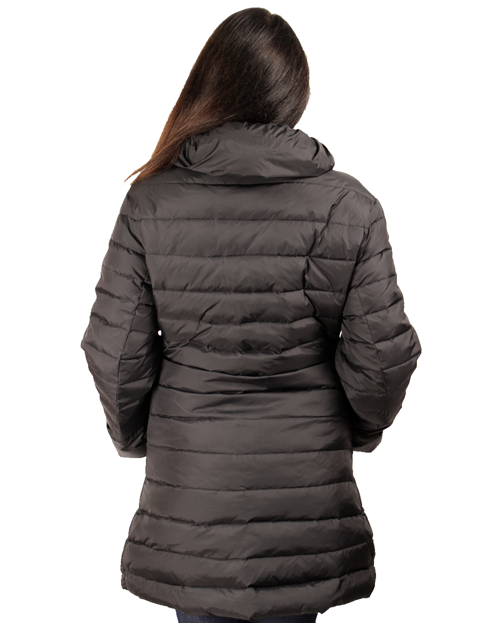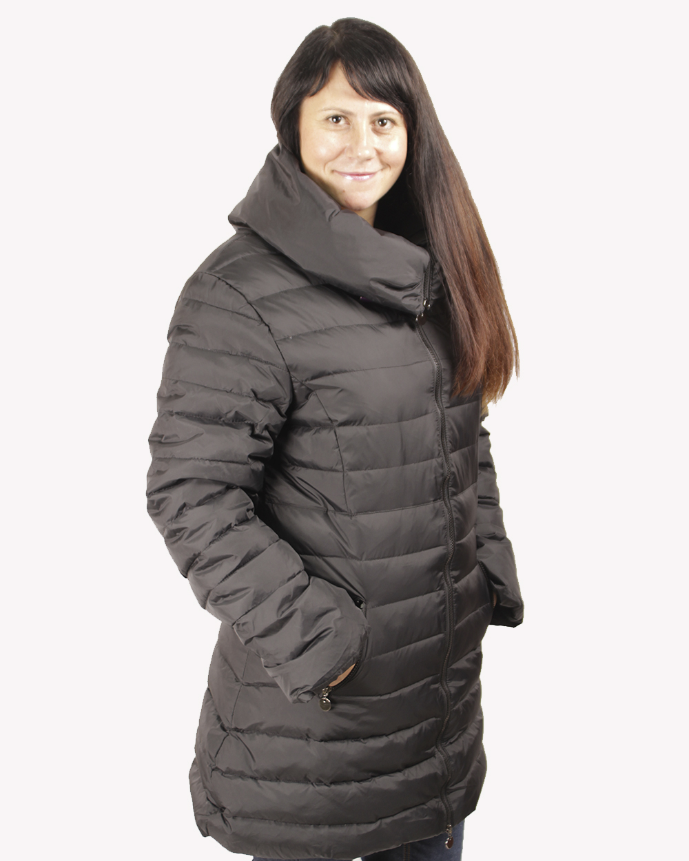 Женский пуховик, стёганный по всей длинне. Высокий воротник не позволин продуть шею и горло. Теплая удобная модель, хорошо сочитается с джинсами и брюками.