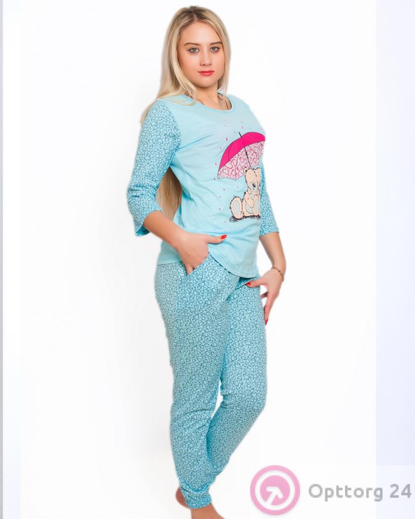 Женская трикотажная пижама голубово цвета с принтом в виде мишек под зонтиком.