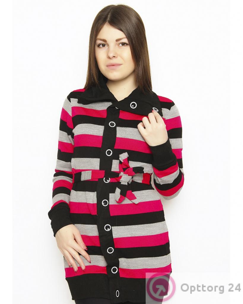 Женский джемпер трёхцветный черный, серый, розовый. Модель в горионтальную полоску с двухцветными пуговицами.