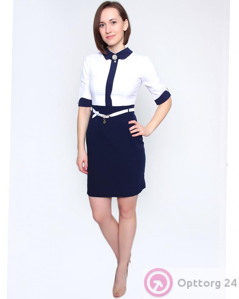 Платье женское с тёмно-синей юбкой и белым верхом с синем воротником и брошью на нём.