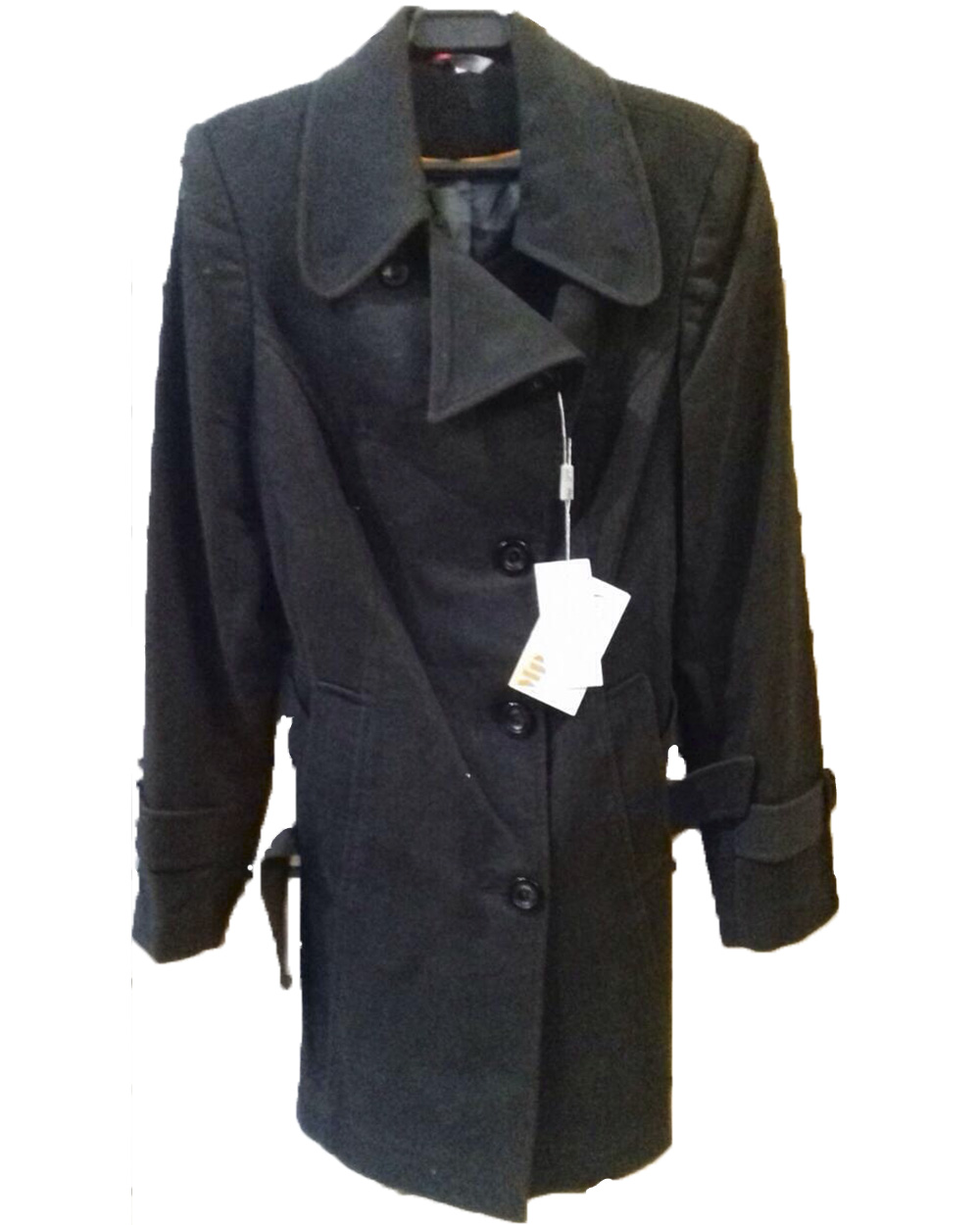 Женское пальто, черного цвета модель имеет длинный, запашной воротник и пояс.