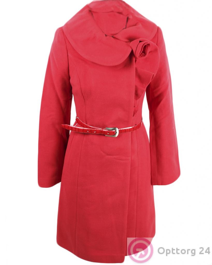 Пальто женское красного цвета с широким воротом и небольшим цветком в области ворота. Модель имеет глянцевый пояс из экокожи.