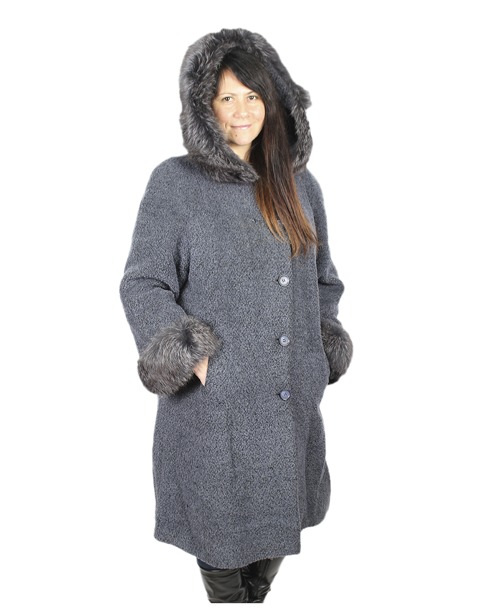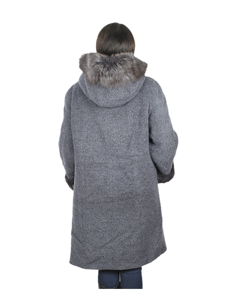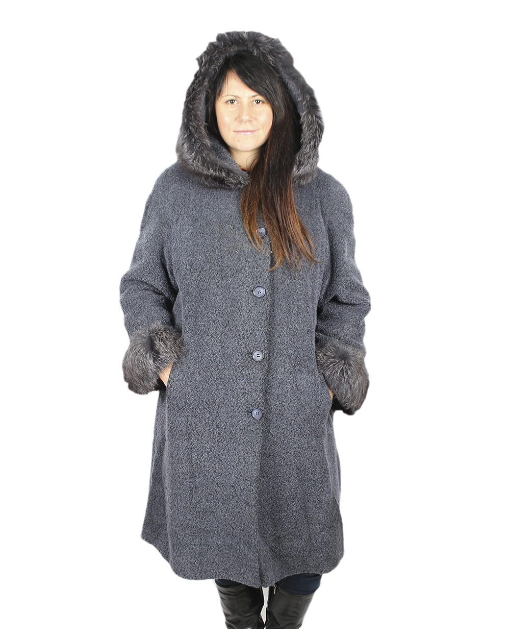 Пальто женское тёмно-серого цвета с капюшоном.