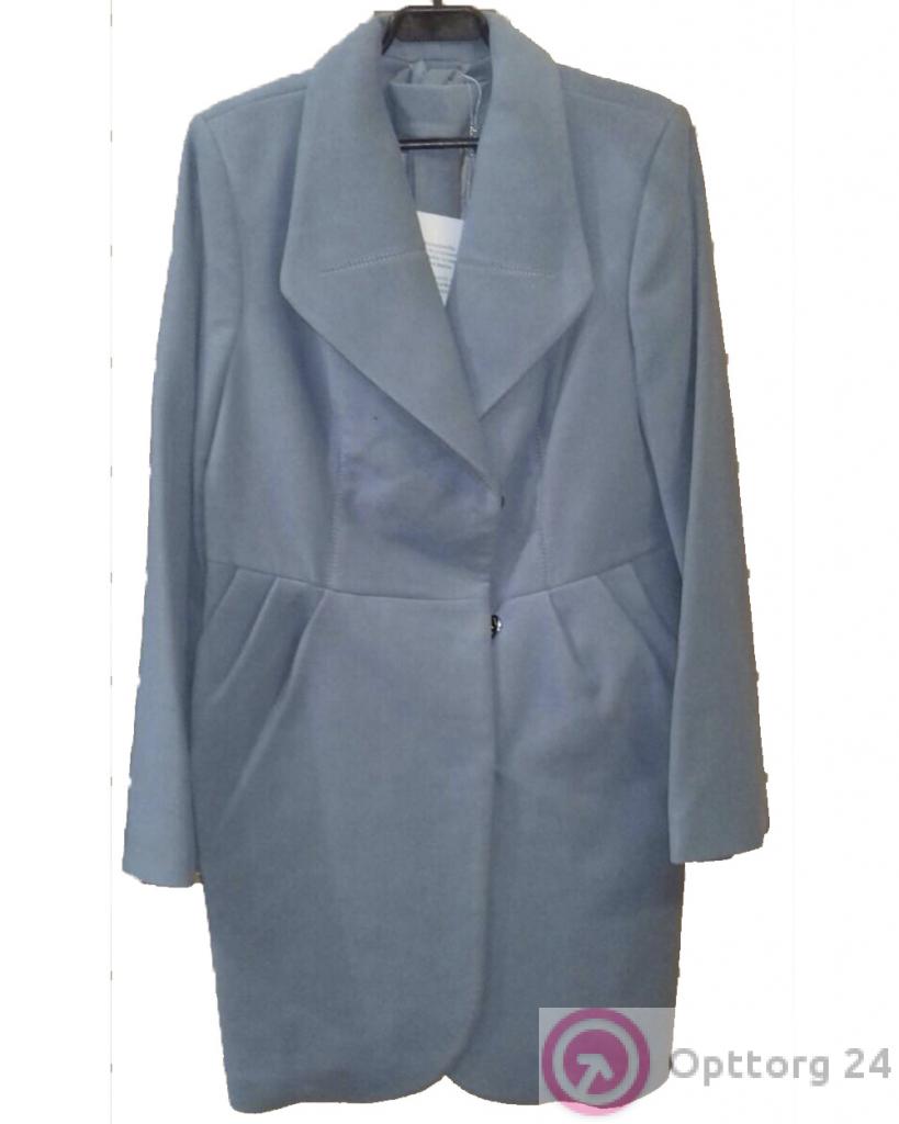 Женское пальто серо-голубого цвета с длинным воротом. Модель имеет складки в области талии.