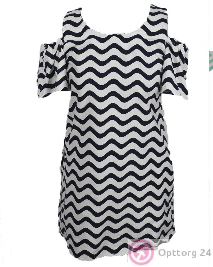 Женское платье белого цвета в волнистую полоску с открытыми плечами. оптом