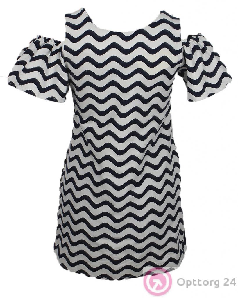 Платье женское с коротким рукавом прямоо кроя в черную волнистую полоску. модель с открытыми плечами.