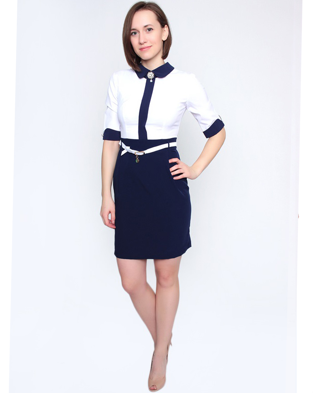 Женское двухцветное платье верх модели выполнен в белом цвете с синей вставкой на вороте и по центру изделия низ выполнен в темно синем тоне. В комплект входит стильный ремешок на золотистой застёжке.