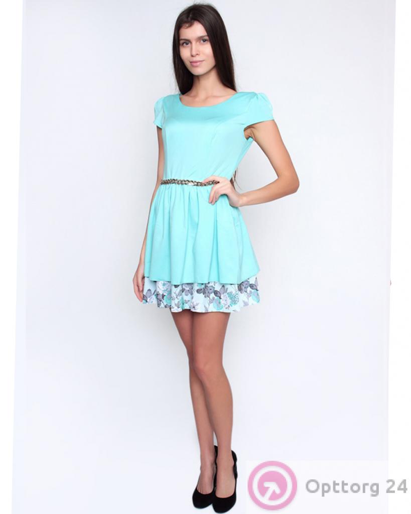Платье женское голубого цвета с цветочной вставкой. Модель с коротким рукавом, украшенна блестящим поясом в виде цепочки.