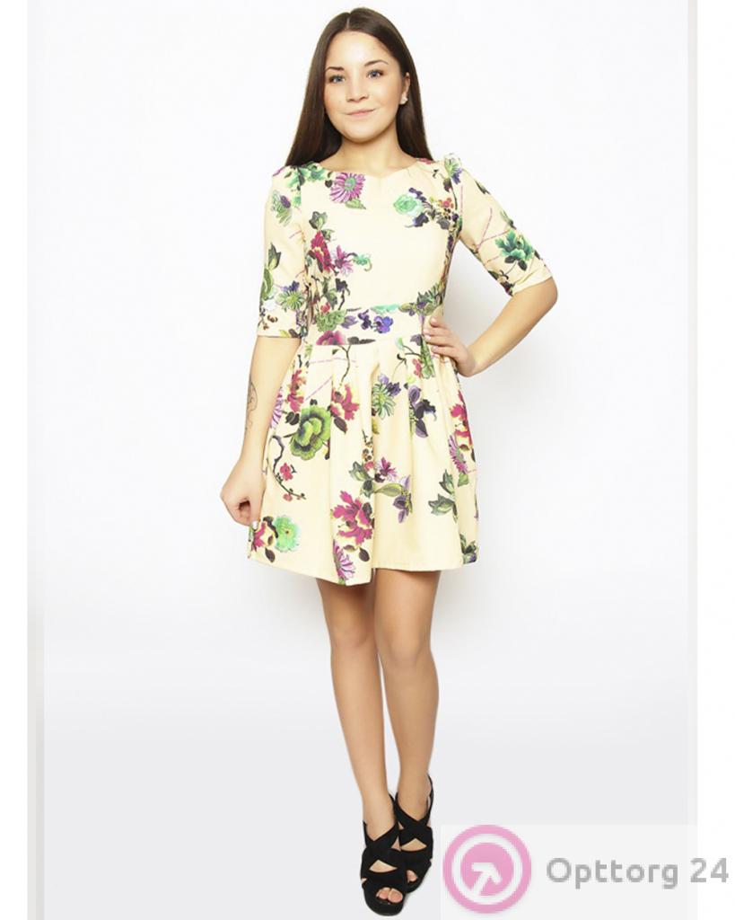 Женское платье кремового цвета с принтом в виде разноцветных ростений. оптом