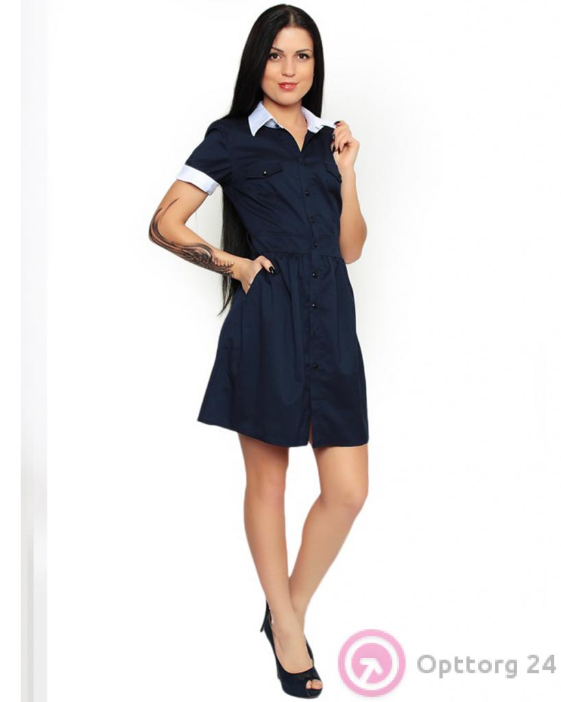 Женское платье на пуговицах тёмно-синего цвета с белым воротником. оптом