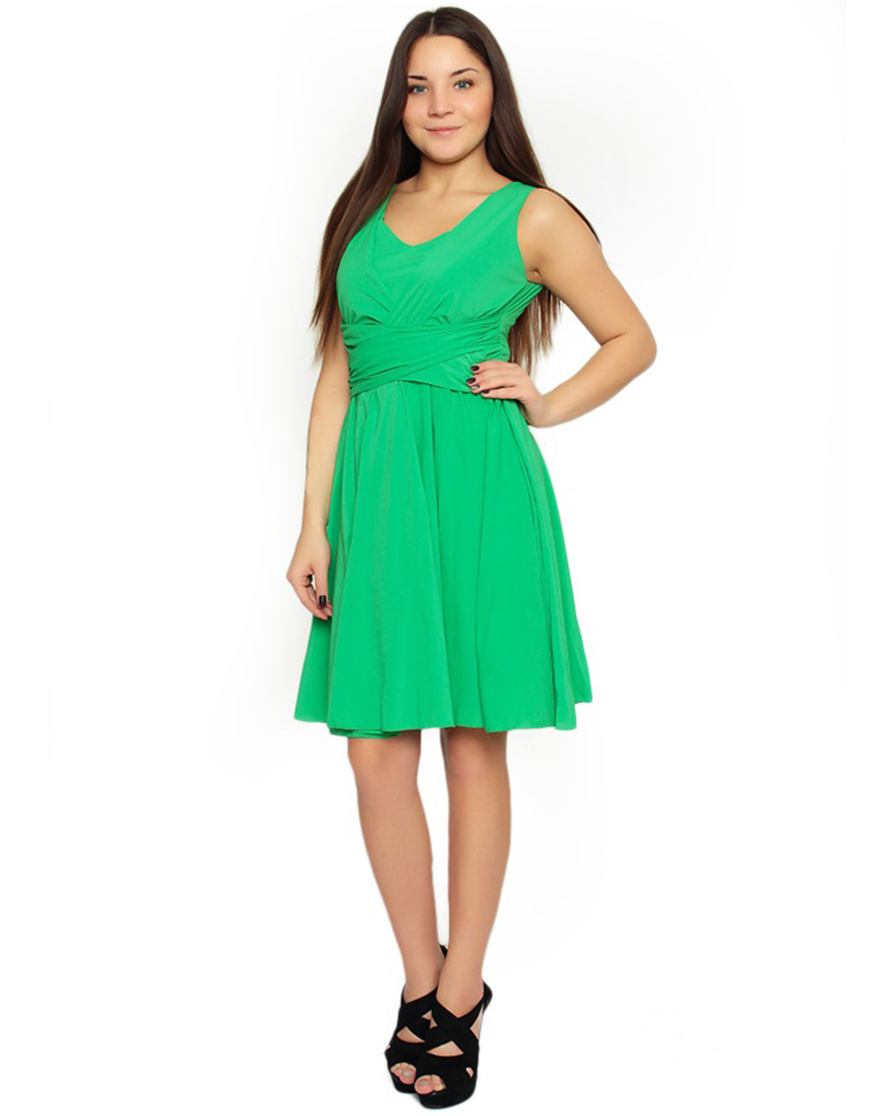 Женское платье насыщенного зеленого цвета с широким пересекающимся поясом.