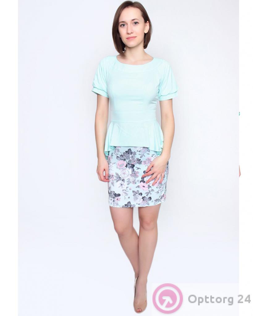 Женское платье нежно- голубого цвета с принтом на юбке. оптом
