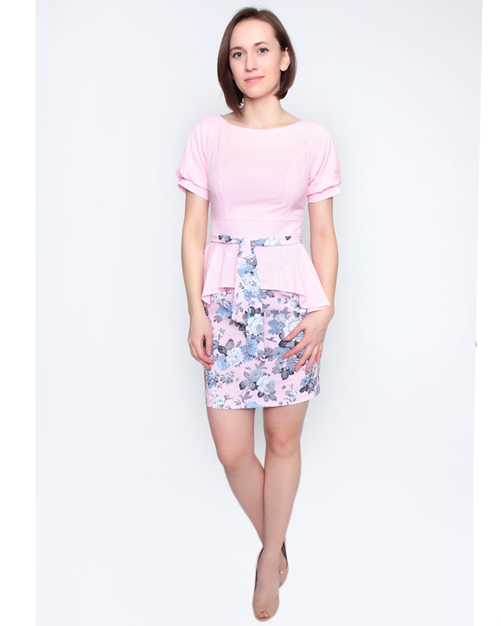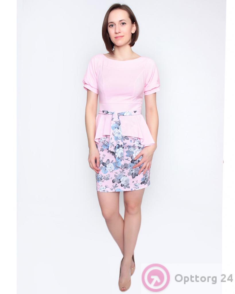 Платье женское нежно-розового цвета с поясом, Модель с коротким рукавом и принтом на юбке в виде цветом. Пояс украшен большим рюшем.