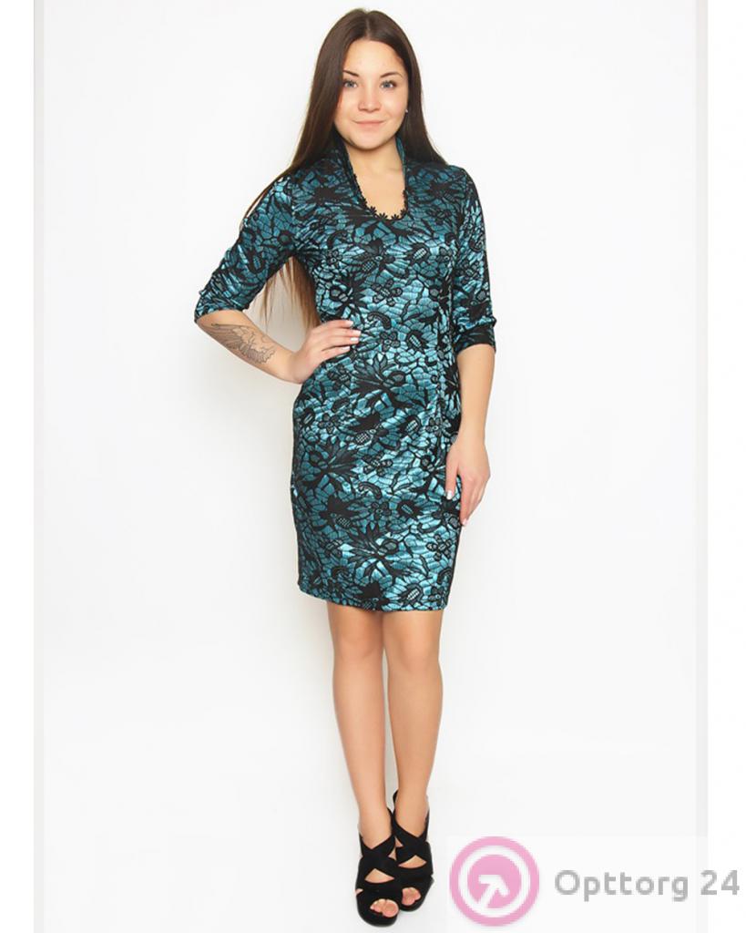 Женское платье украшенно кружевом на вороте, зеленого цвета с силуэтом цветов по всей поверхности.
