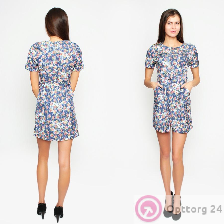Женское платье синего цвета с мелким принтом в виде мелки цветов оптом