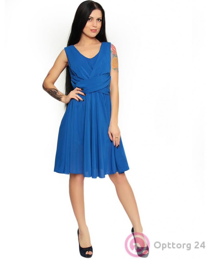 Женское платье с поясом синего цвета пояс крестом переплетается на талии.
