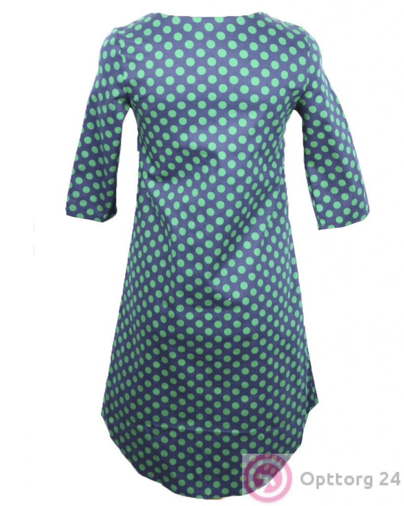 Платье женское тёмно-синего цвета с зеленым горохом. Модель выполнена с округлым вырезом и укороченным рукавом на 3/4