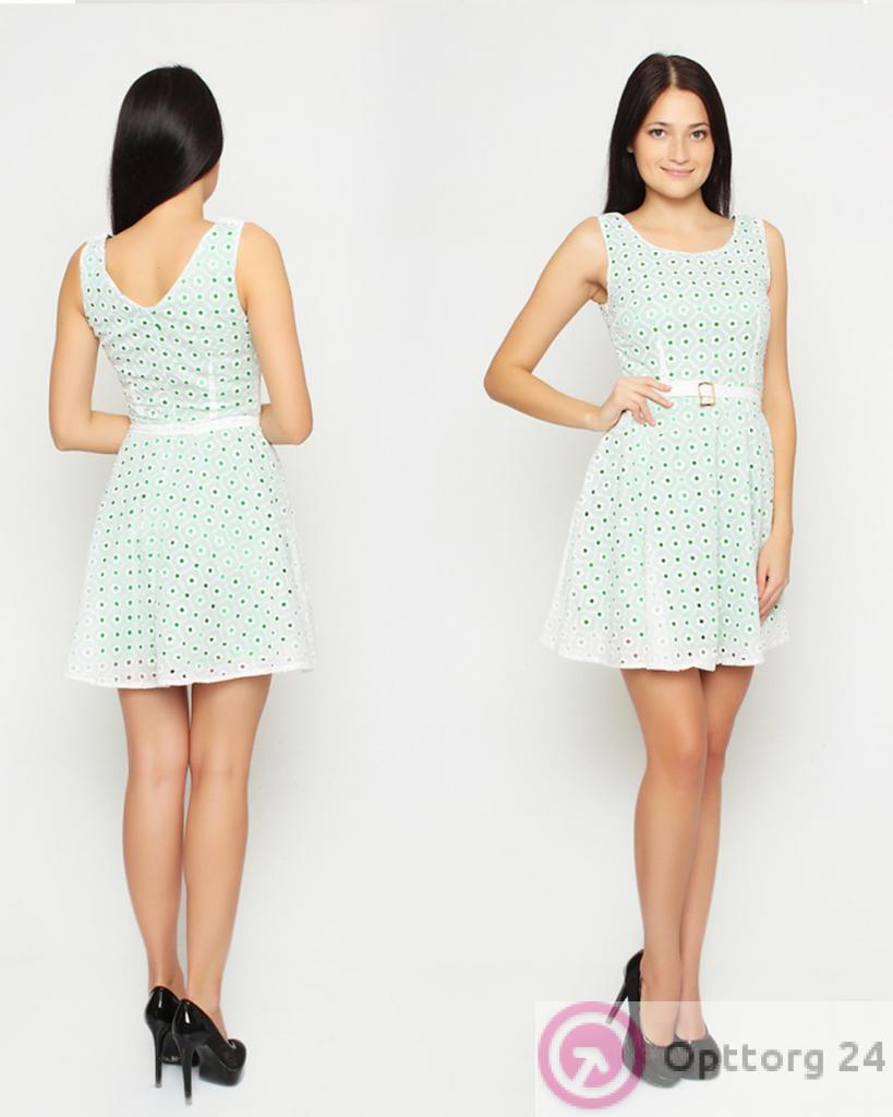Платье женское нежно зелёного цвета с зеленым горохом по всей поверхности модели.