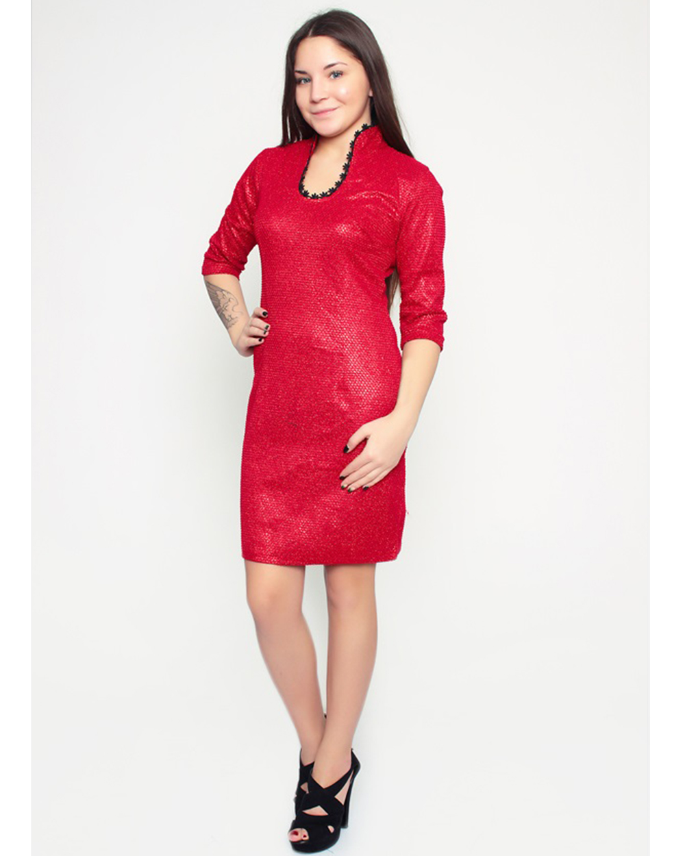 Женское платье ярко-красного цвета с еле заметным силуэтом цветов. модель оснащена рукавом в 3/4 и ворот украшен кружевами.