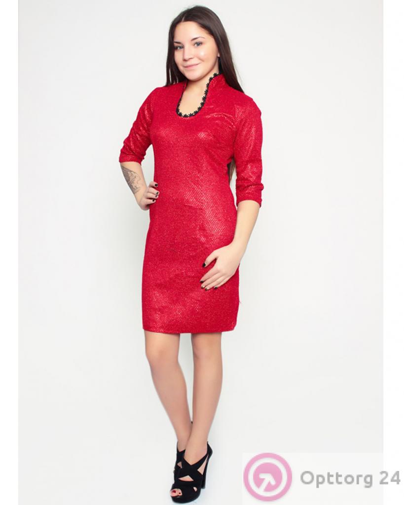 Женское платье ярко-красного цвета с кружевом на вороте. оптом