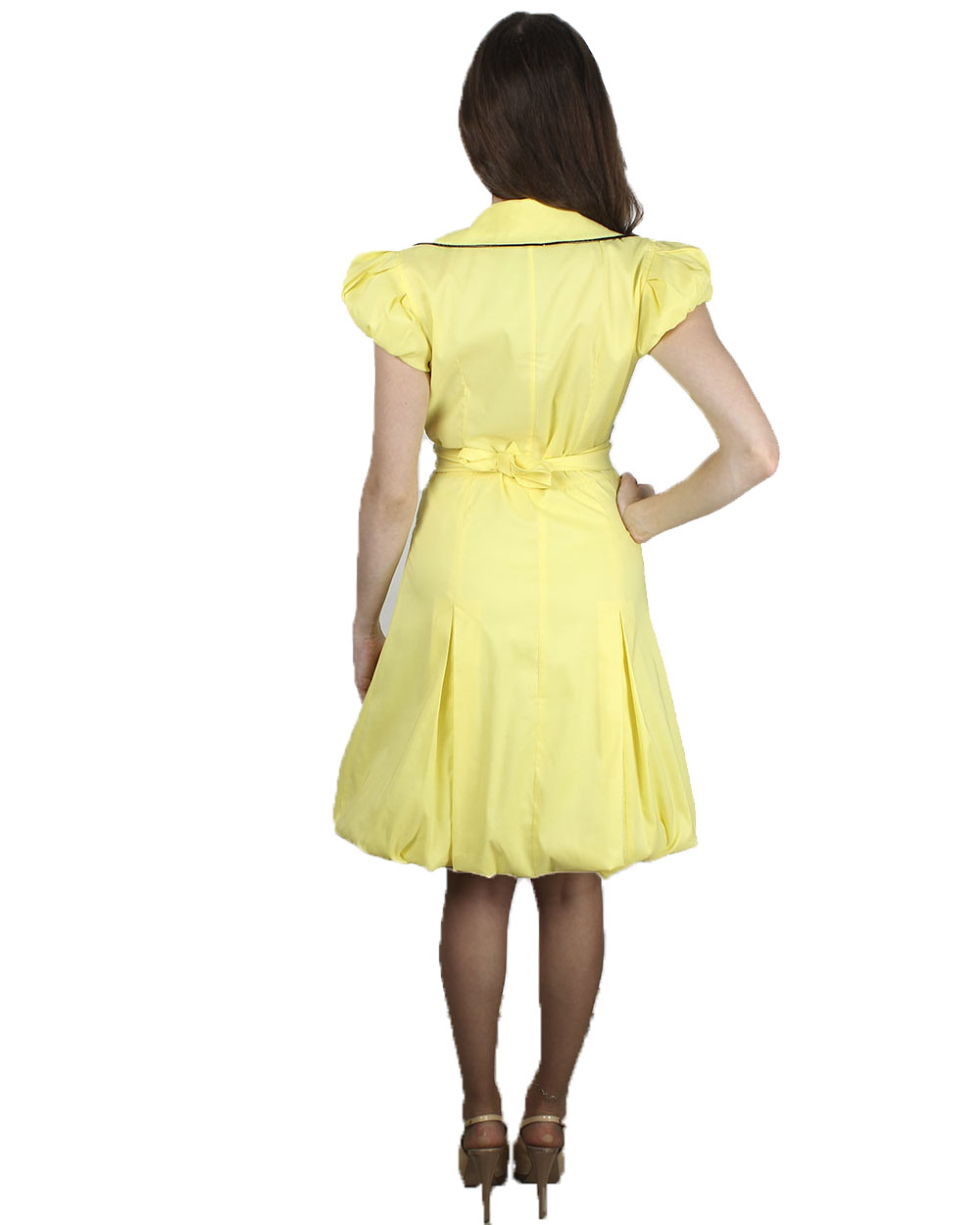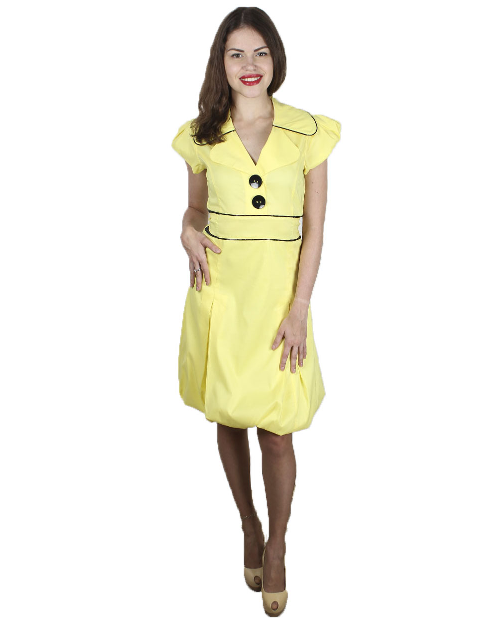 Турецкое платье для женщин, модель желтого цвета с черной прошивкой и большими черными пуговицами на верхней части изделия.