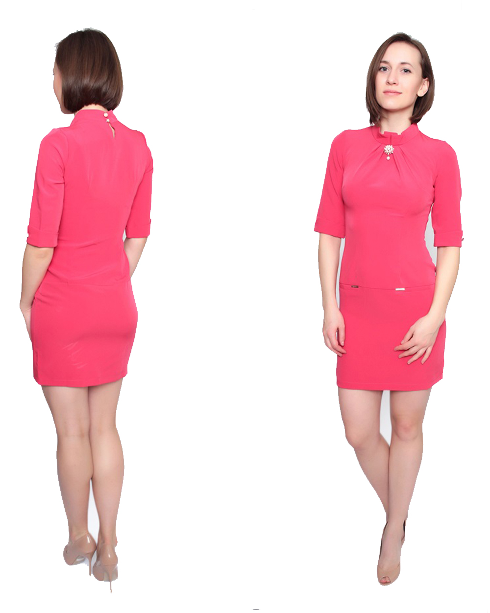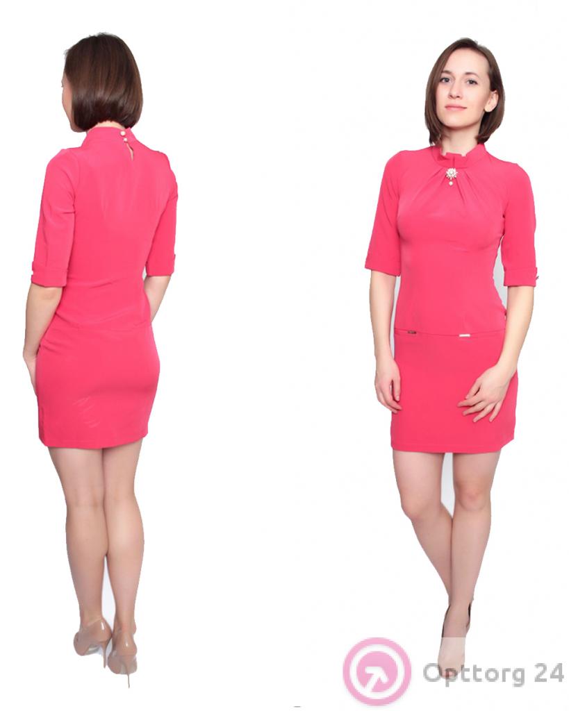 Женское приталенное платье розового цвета с брошью в области груди. оптом