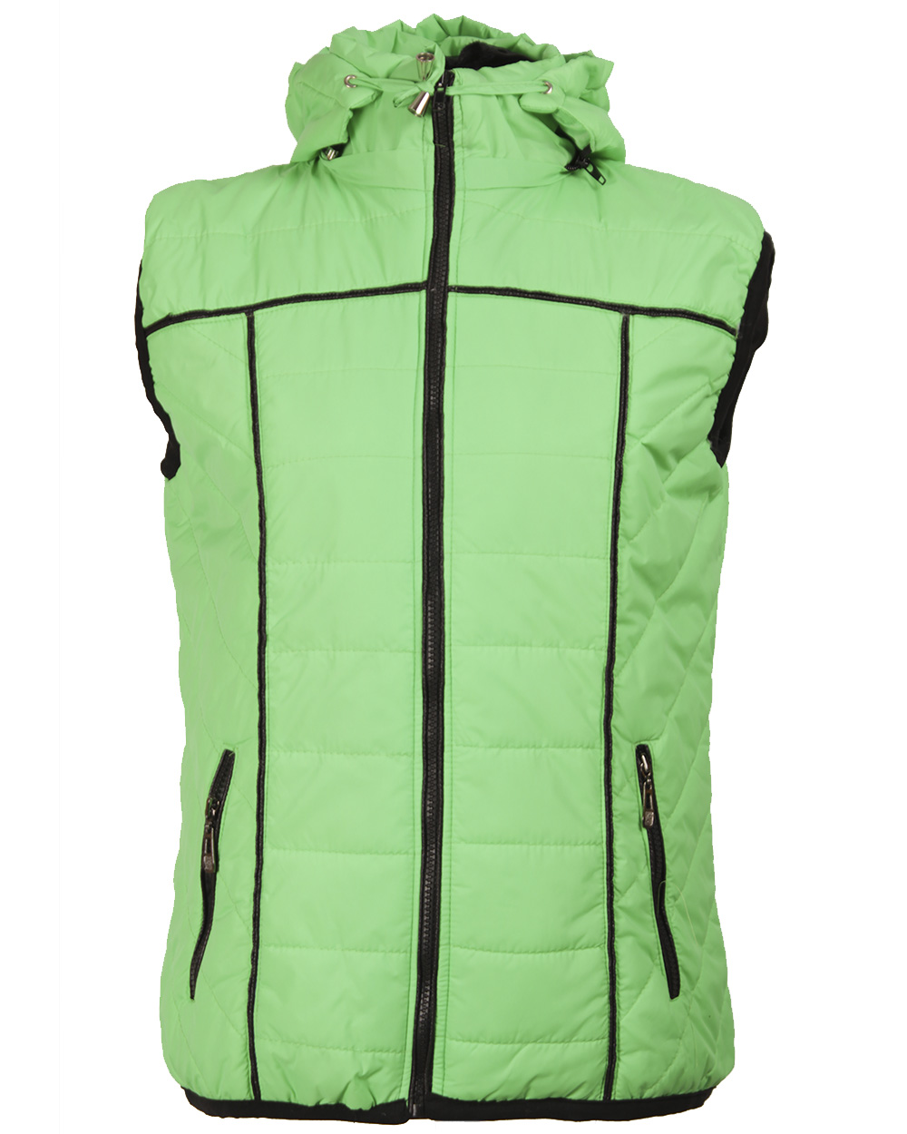 Женский , стильный жилет салатового цвета с капюшоном и карманами.