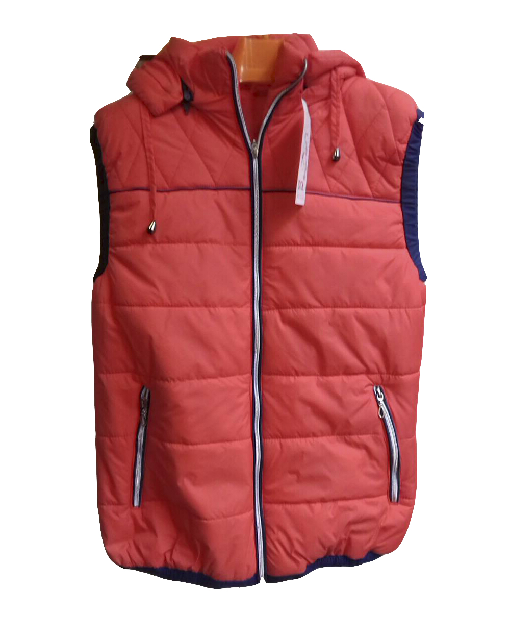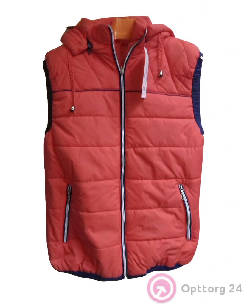 Яркий стеганый жилет прямого кроя. В изделии есть мягкий воротник-стойка и контрастная белая застежка-молния.