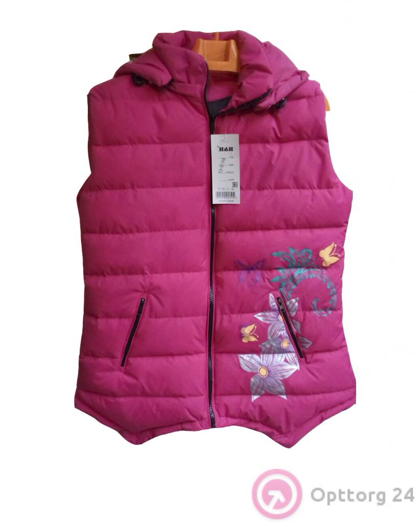 Яркий розовый жилет с двумя карманами на молнии. Модель имеет оригинальный цветочный принт спереди.