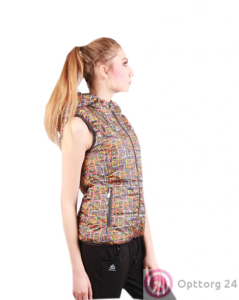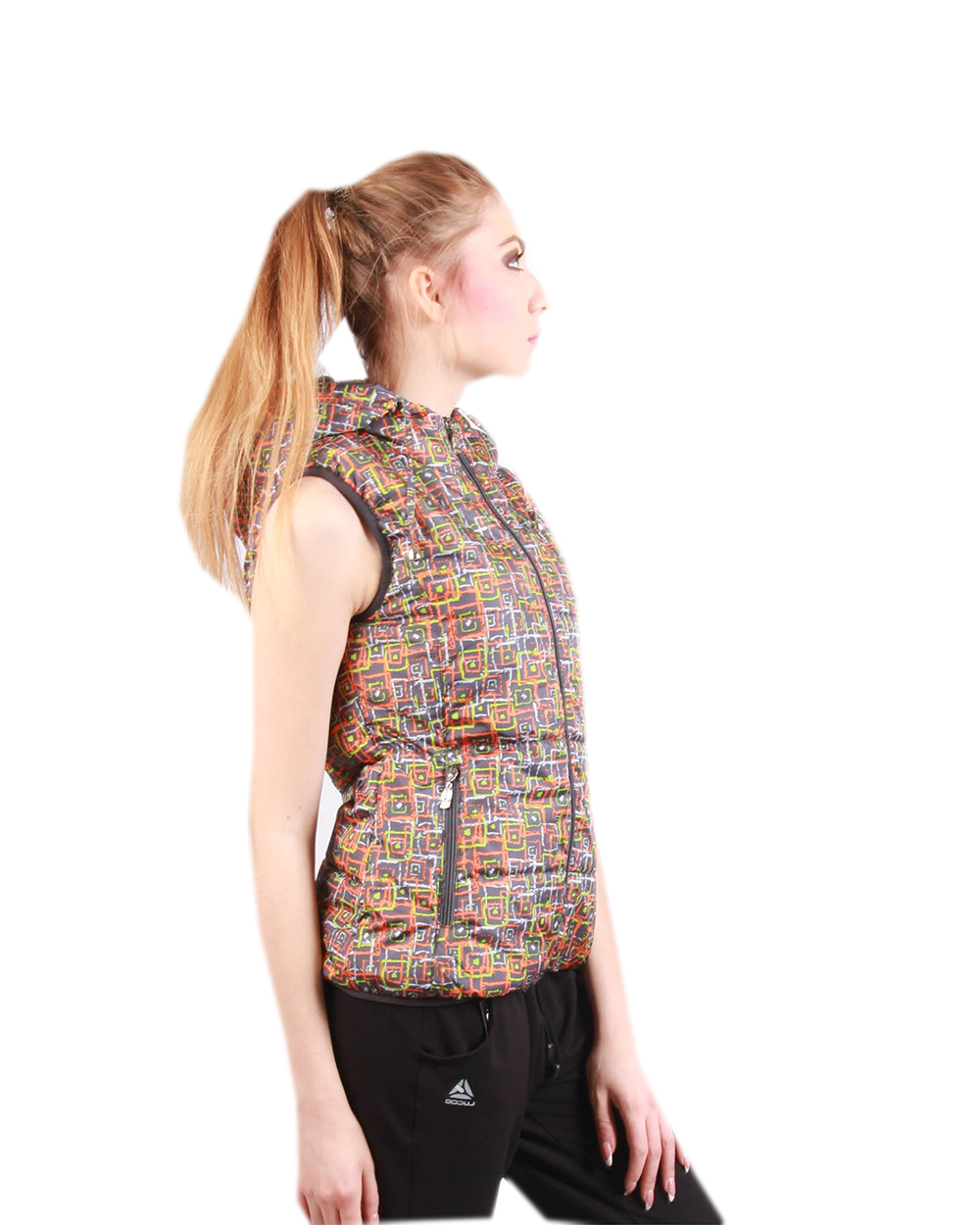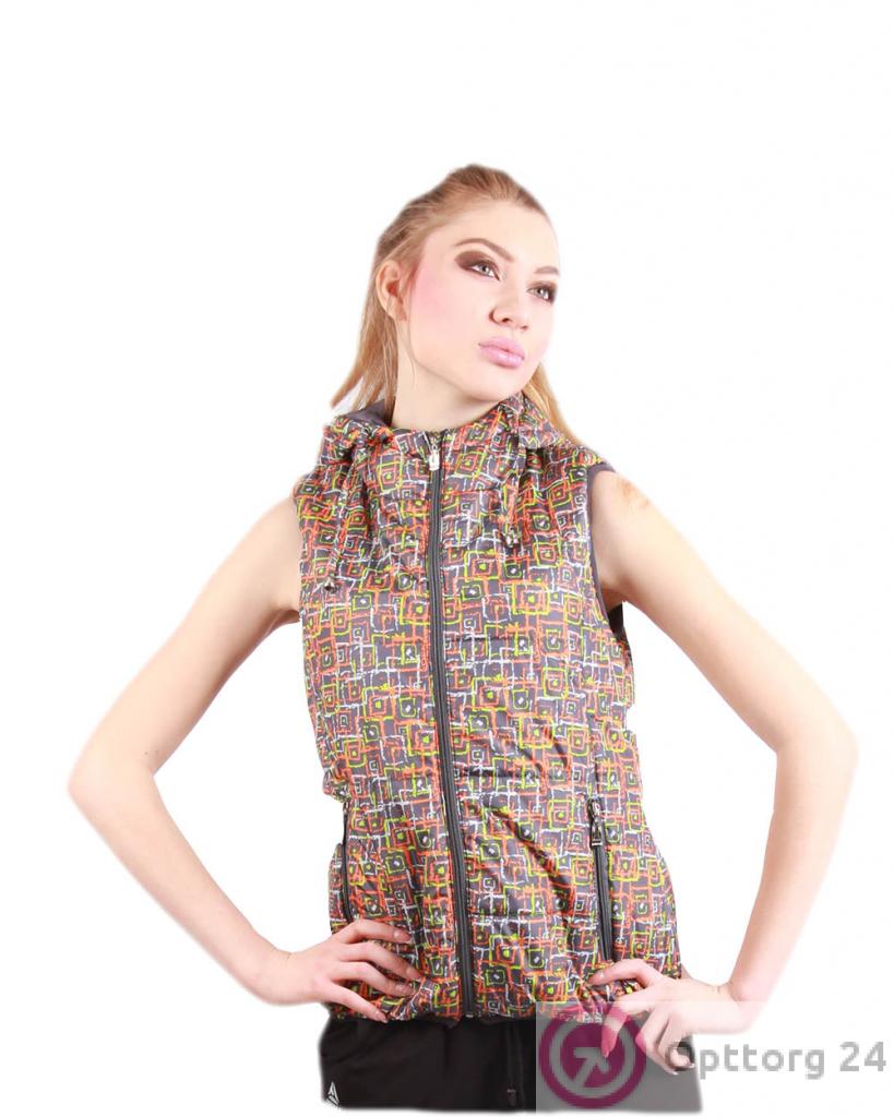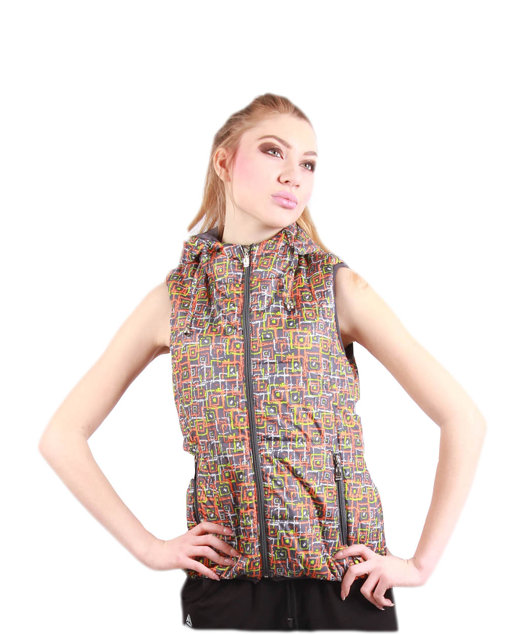 Пестрый женский жилет на молнии.В модели предусмотрено капюшон и два кармана.