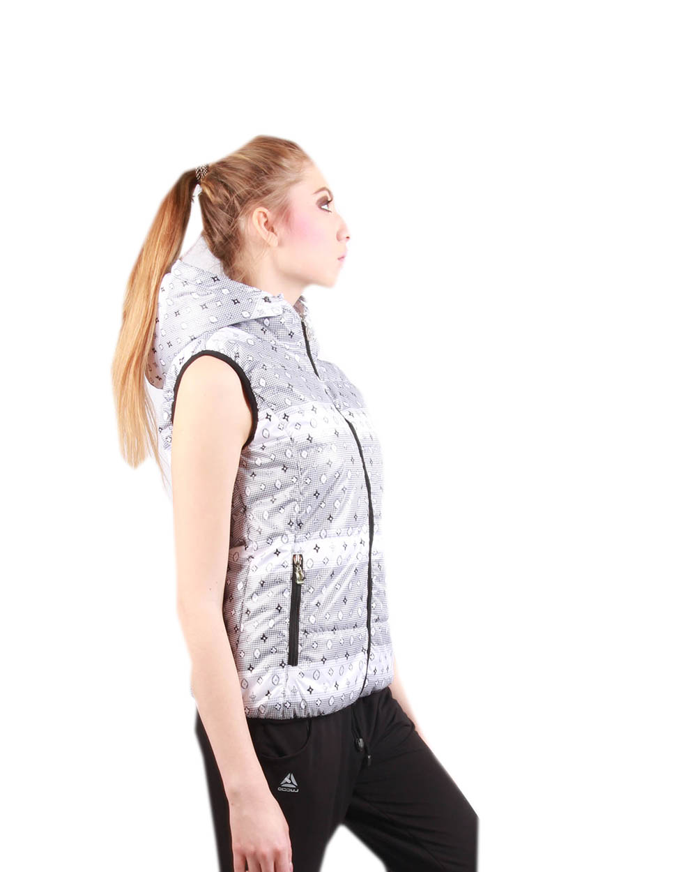 Оригинальный женский жилет нежного светло-серого цвета в белую полоску с мелким принтом. В модели предусмотрены два боковых кармана и капюшон.