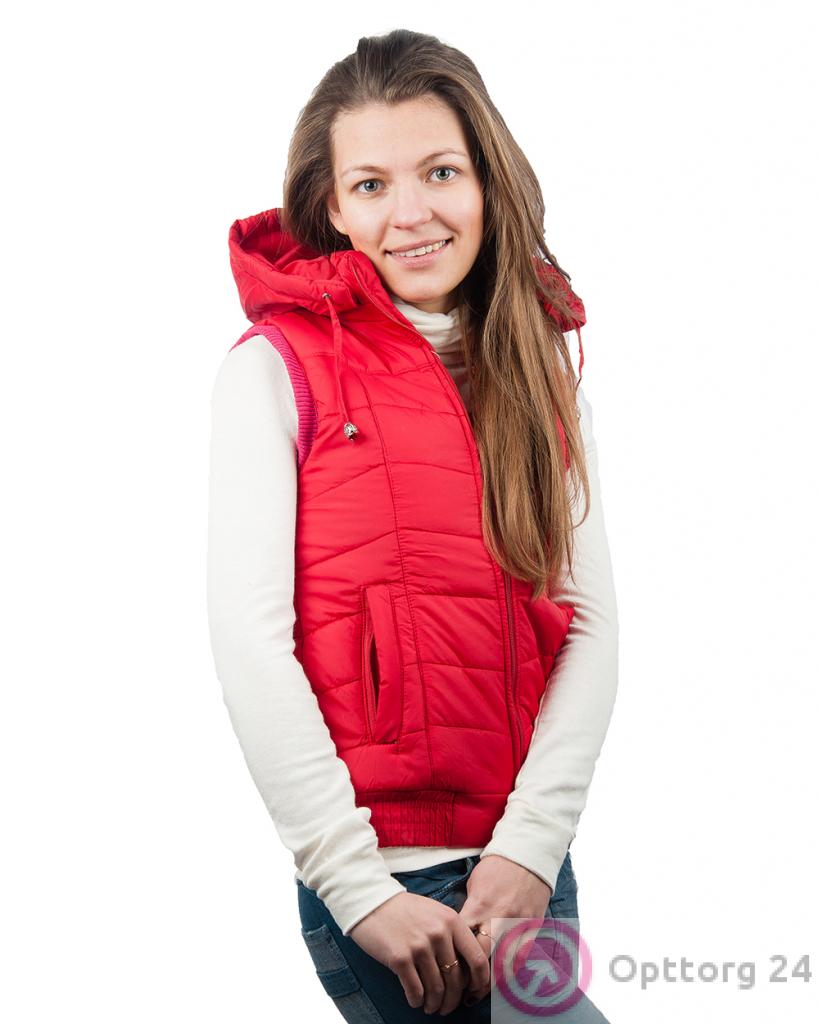 Жилетка женская на синтепоне красного цвета с капюшоном оптом