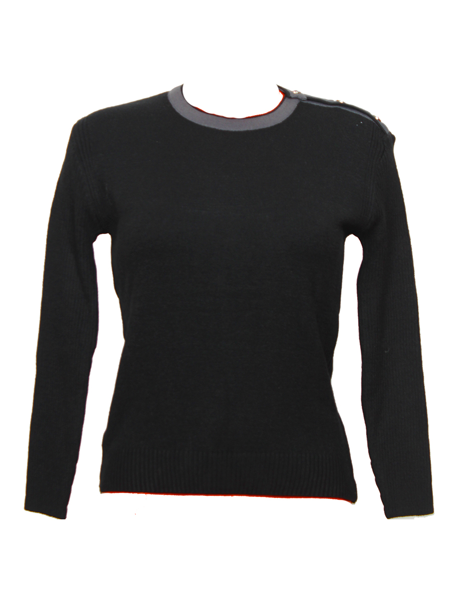 Женский джемпер черного цвета. Стиль классический. На одном плече есть пуговицы.