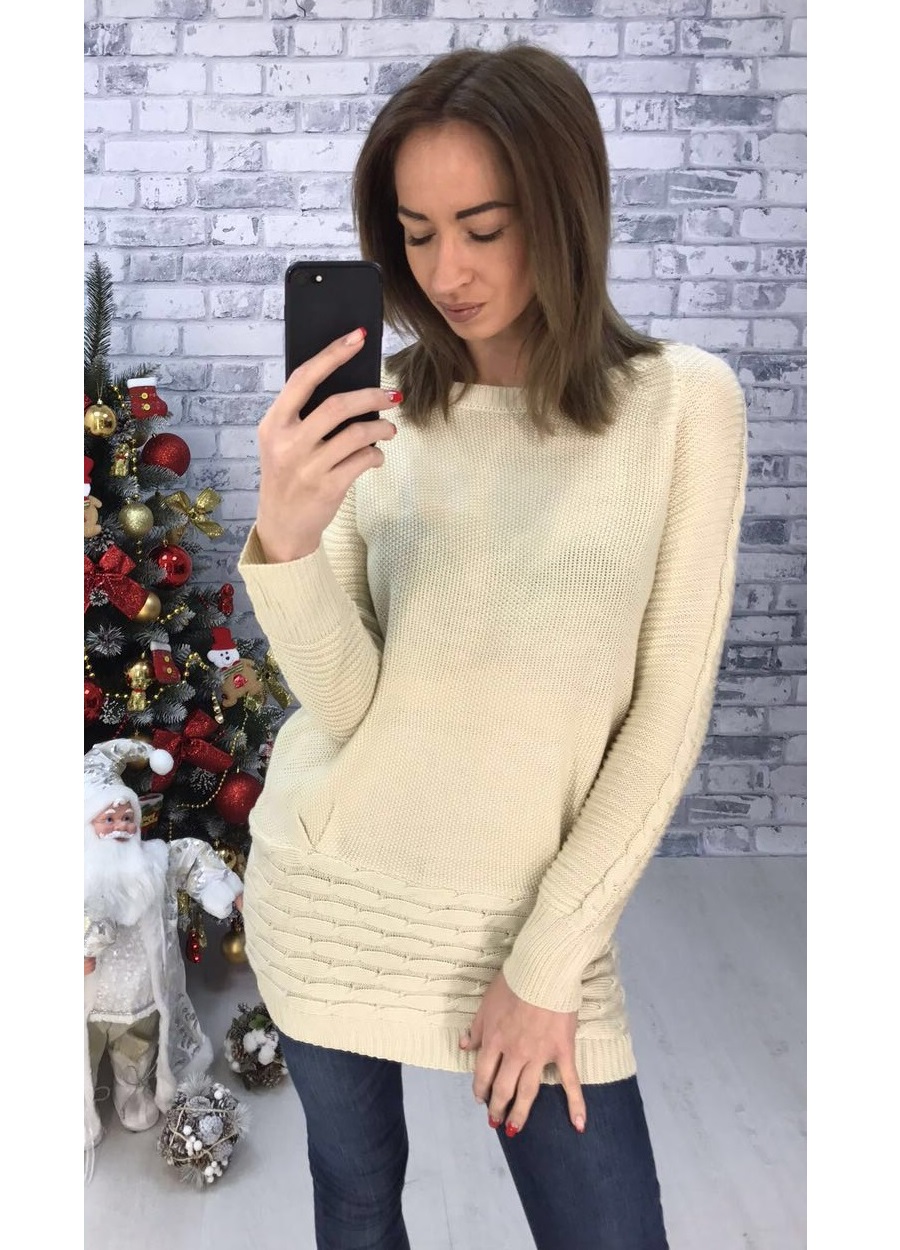Удлиненный джемпер прекрасно утепляющий в зимнюю непогоду. Нежный кремовый цвет приятен для глаза, а само изделие из качественного материала - на ощупь. имеет украшение в виде вышитого узора