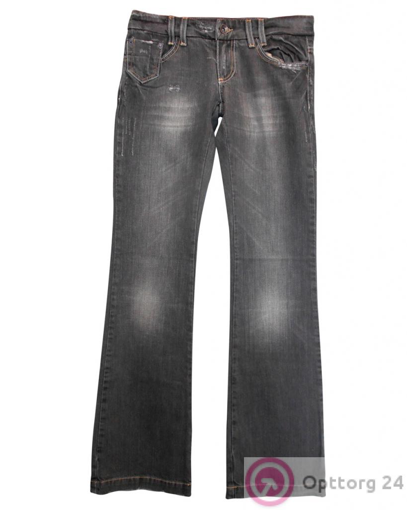 Джинсы с потертостями, прямого покроя, посадка на талии. Пять карманов, на поясе двойные шлевки, застегиваются на молнию и пуговицу.