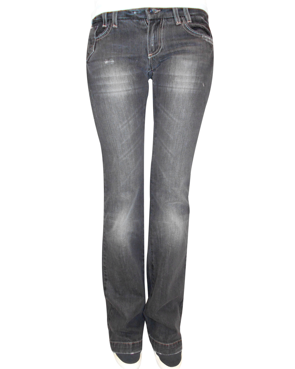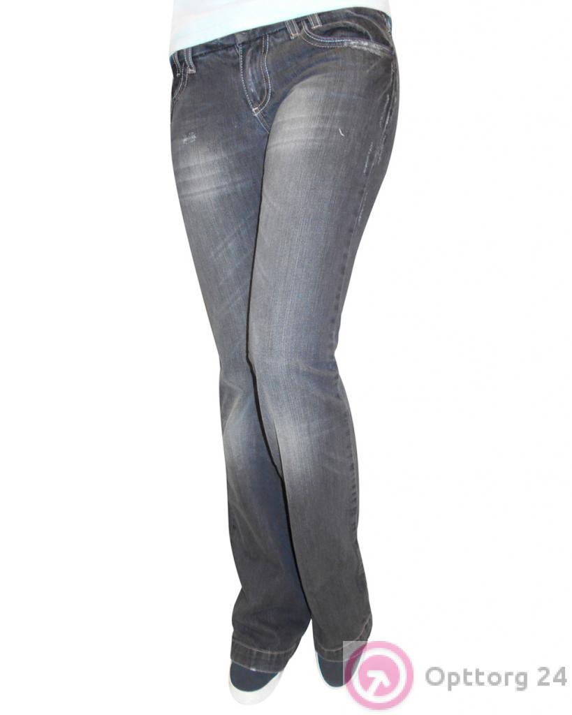 Джинсы выполнены из ткани серого цвета. Детали: прямой крой, три боковых и два задних кармана, застежка на молнию и пуговицу.