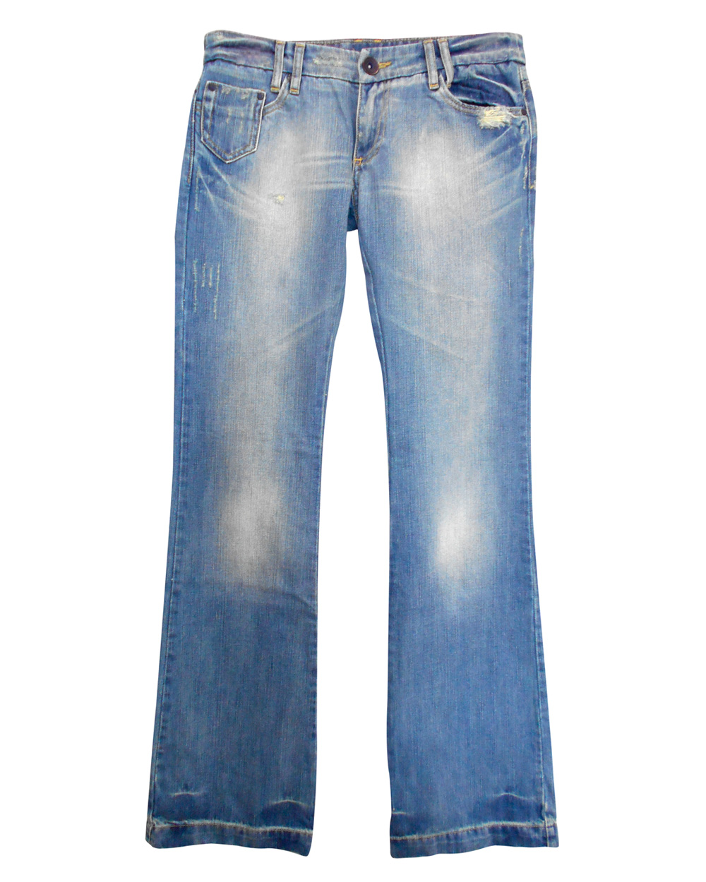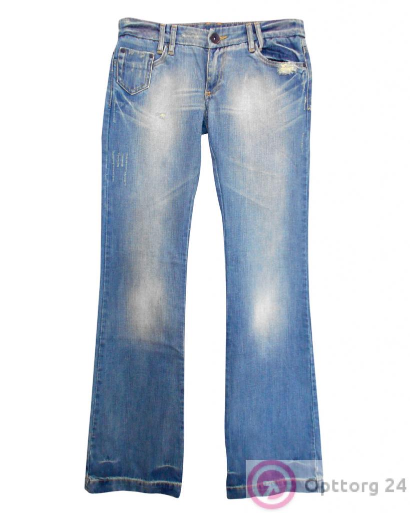 Прямые джинсы с потертостями, посадка на талии. Пять карманов, на поясе двойные шлевки, застежка на молнию и пуговицу.